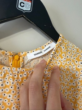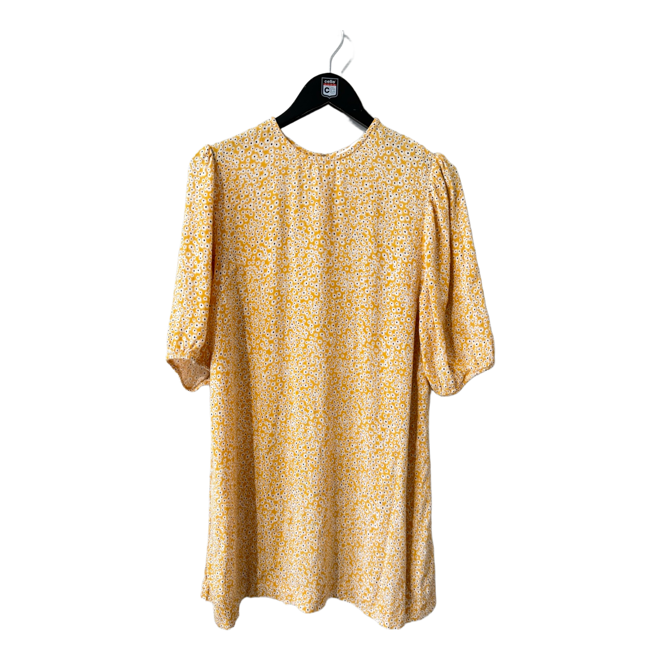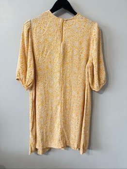 Yellow floral print dress with puff sleeves. Features a round neckline and back zipper closure. Size L.