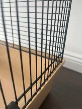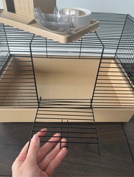 Hamster cage in beige and black with accessories. Includes a small house, platforms, tunnels, a food bowl, wood shavings, and wooden chews.