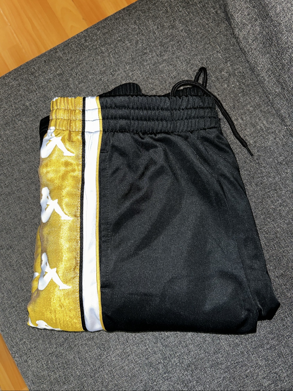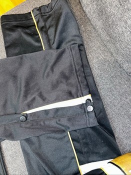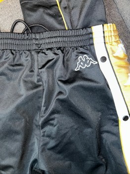 Black sport trousers with gold and white side details. Featuring press studs along the sides and an adjustable drawstring waist.