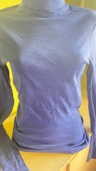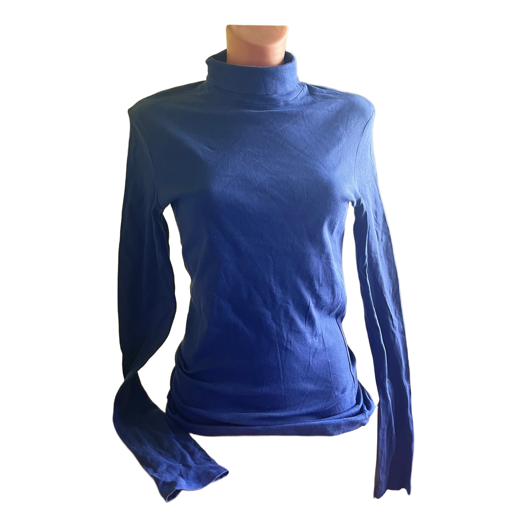 Long-sleeved ribbed turtleneck top in blue.