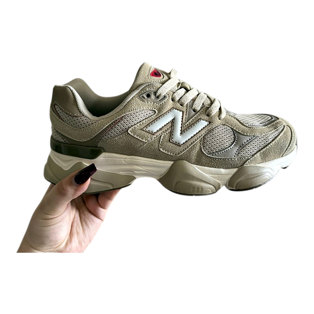 Beige New Balance sneakers with suede and mesh upper. Features white logo detail and thick sole.