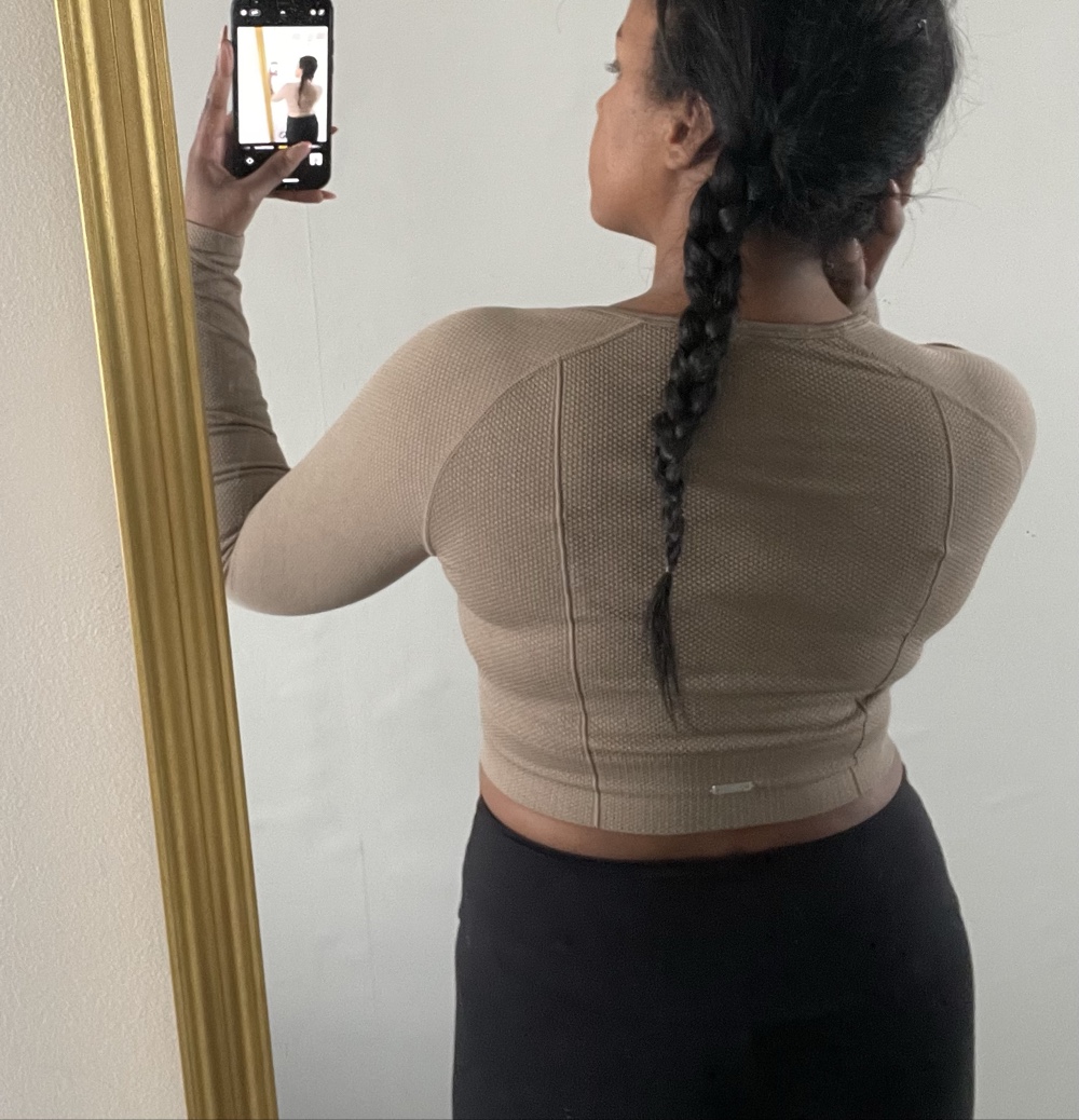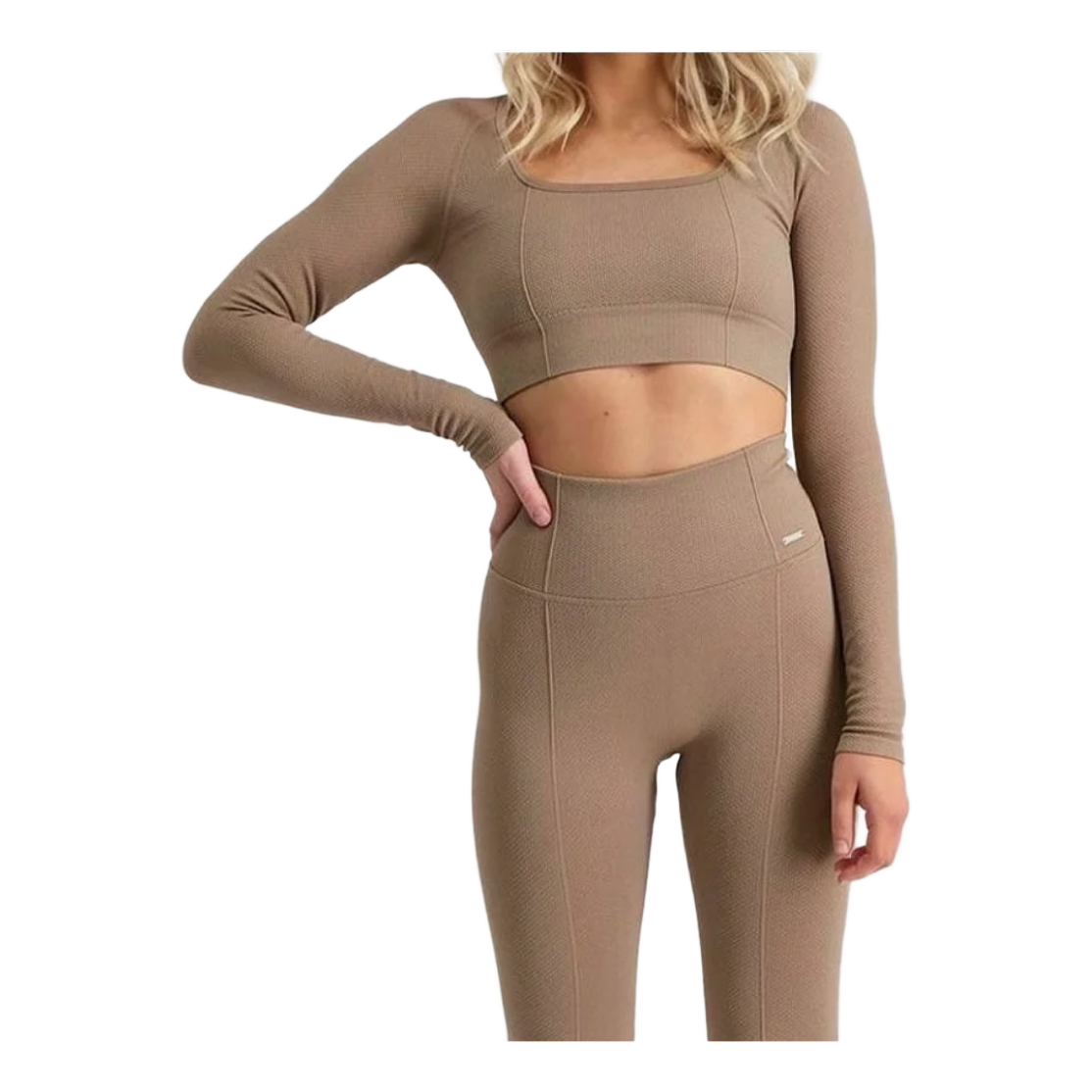Beige long-sleeved top with a textured surface and a cropped cut. Suitable for athletic use.