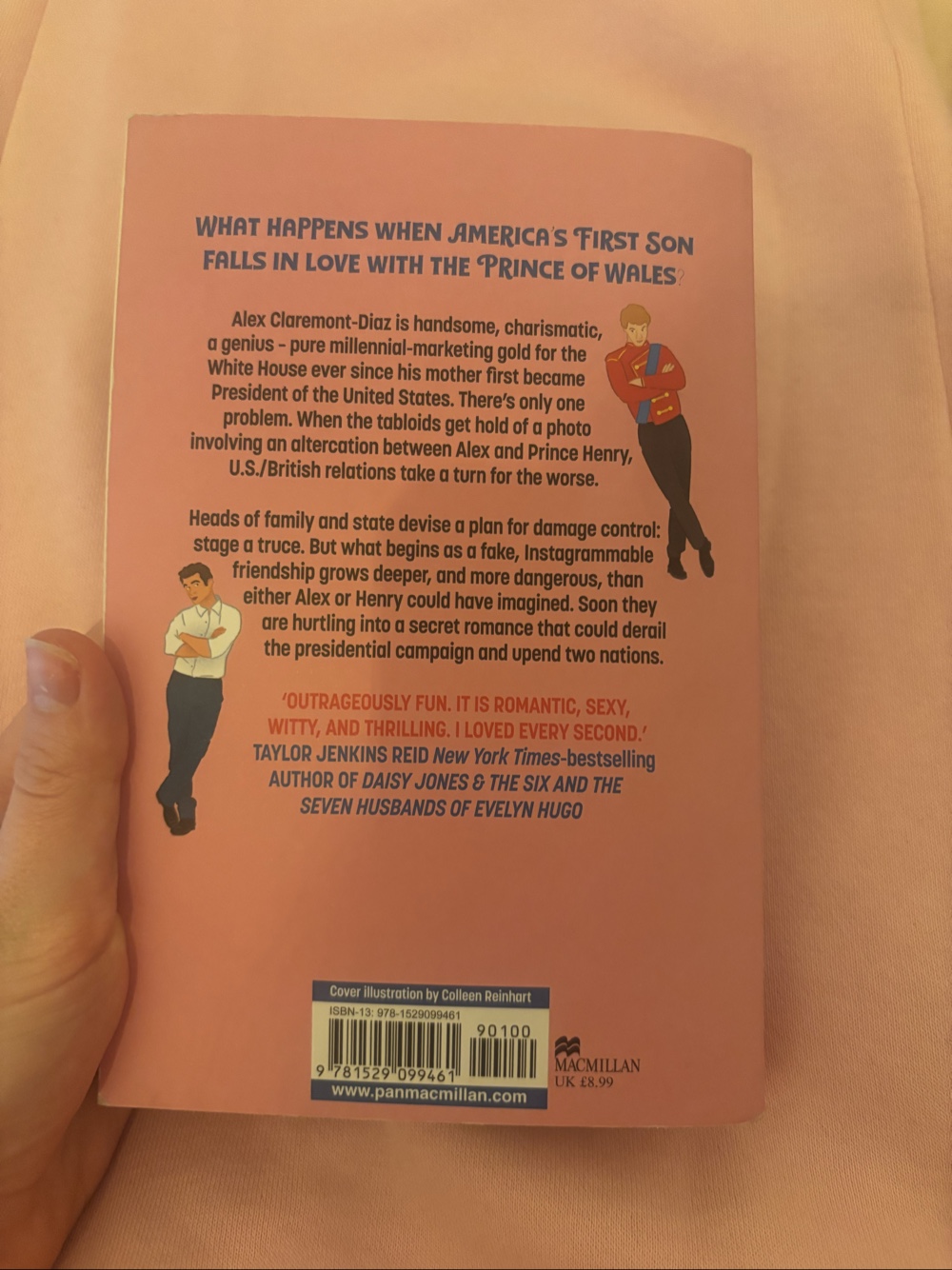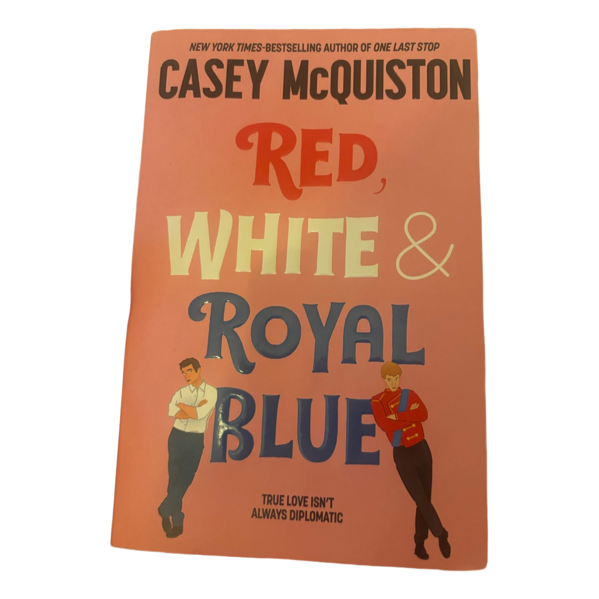 Paperback book titled Red, White and Royal Blue by Casey McQuiston. Romantic fiction novel.