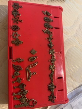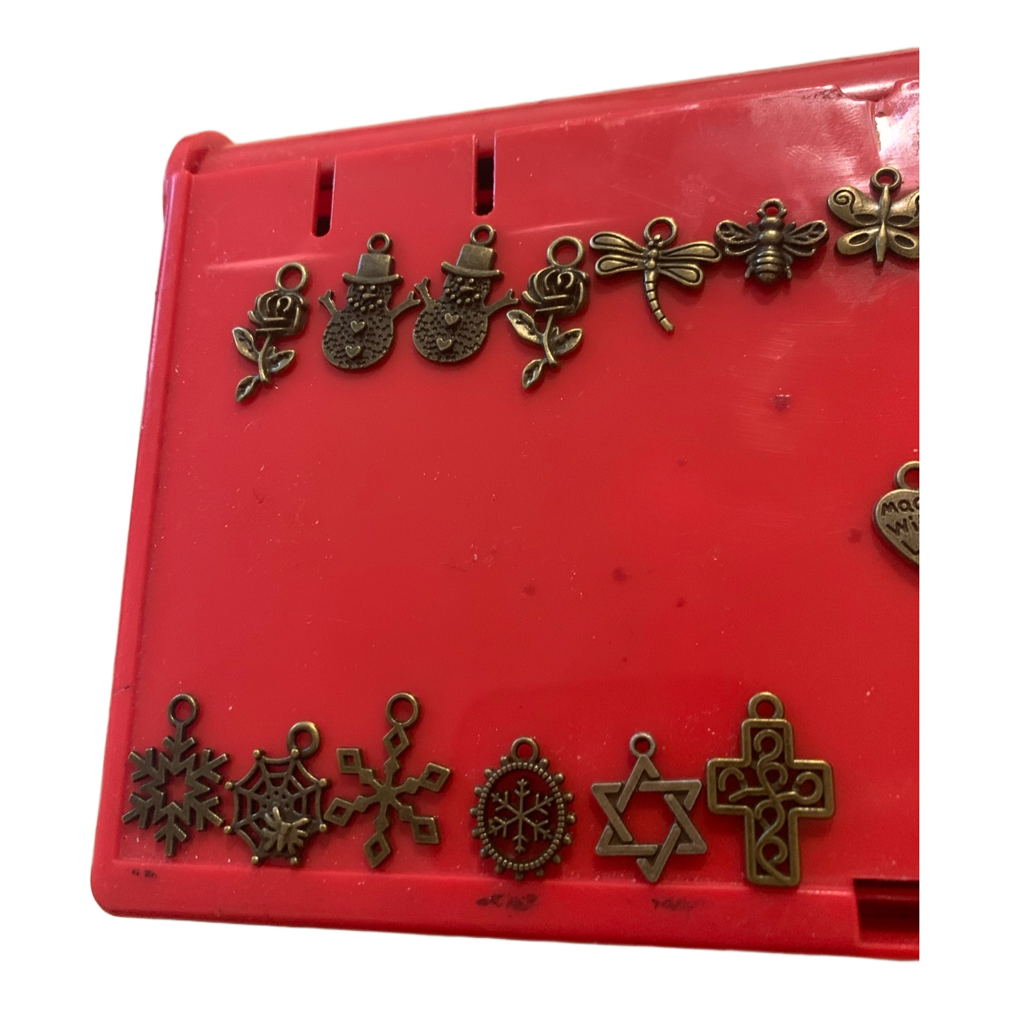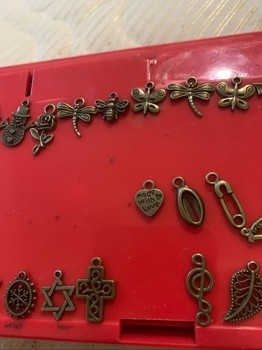 A selection of various bronze-toned jewelry findings and pendants. Includes, among others, key, butterfly, snowflake and flower motifs.