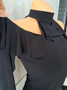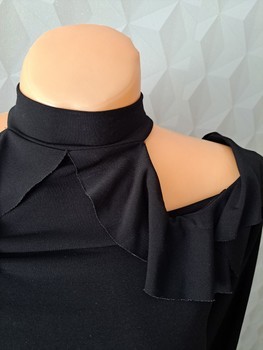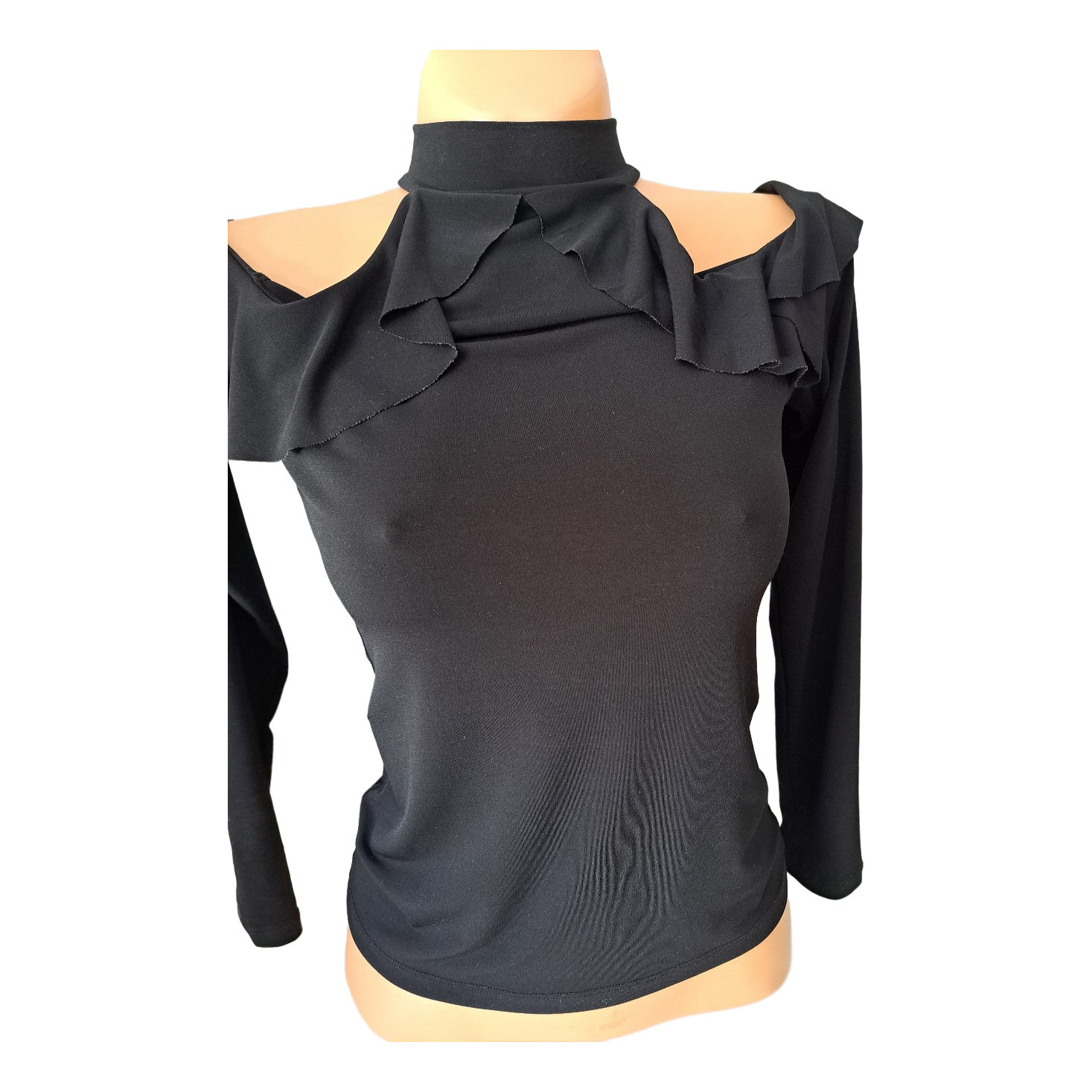 Black top with long sleeves, a high neckline, and decorative ruffles at the shoulders.