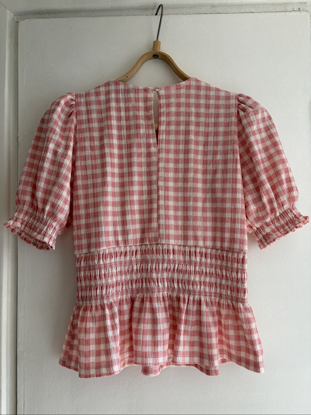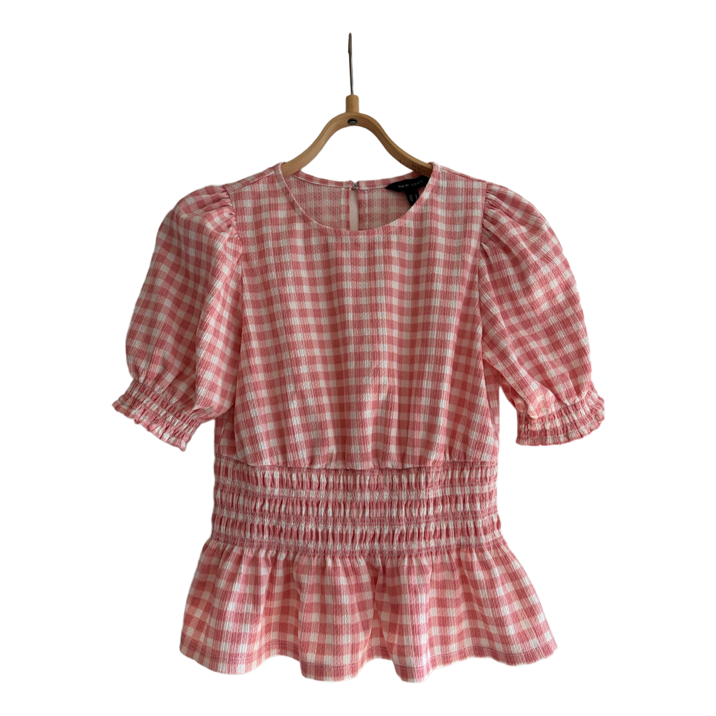 Pink and white gingham top with puff sleeves and a shirred waist. Features a keyhole button closure at the back. From New Look, size 38.