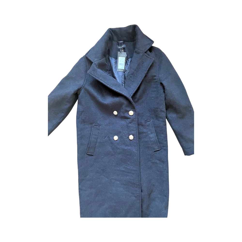 Coat featuring a black color with a double-breasted design. Includes two front pockets and decorative buttons. Tag is visible.