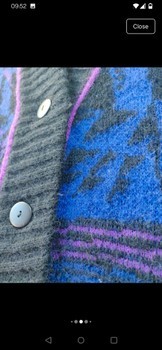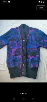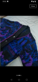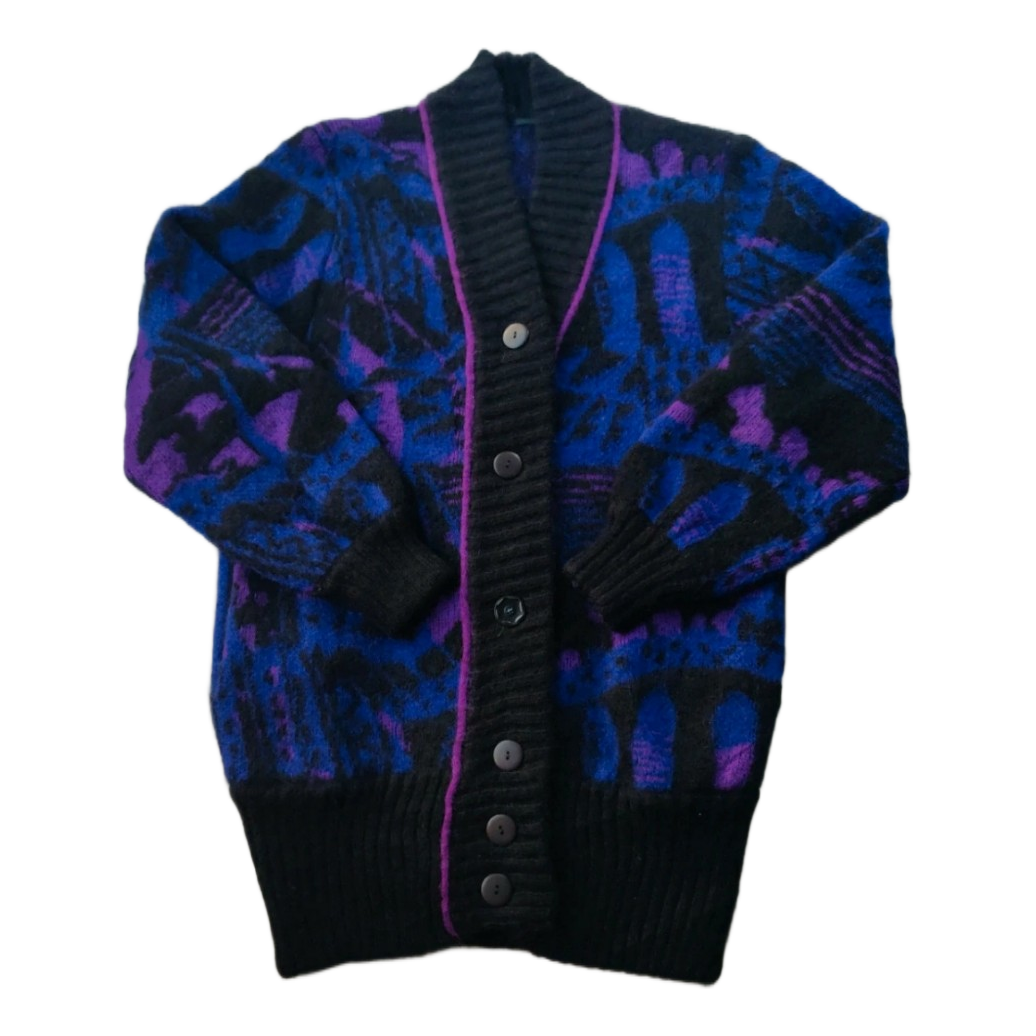 Women's 90s cardigan, with blue, lilac and black abstract patterning. Really soft and warm