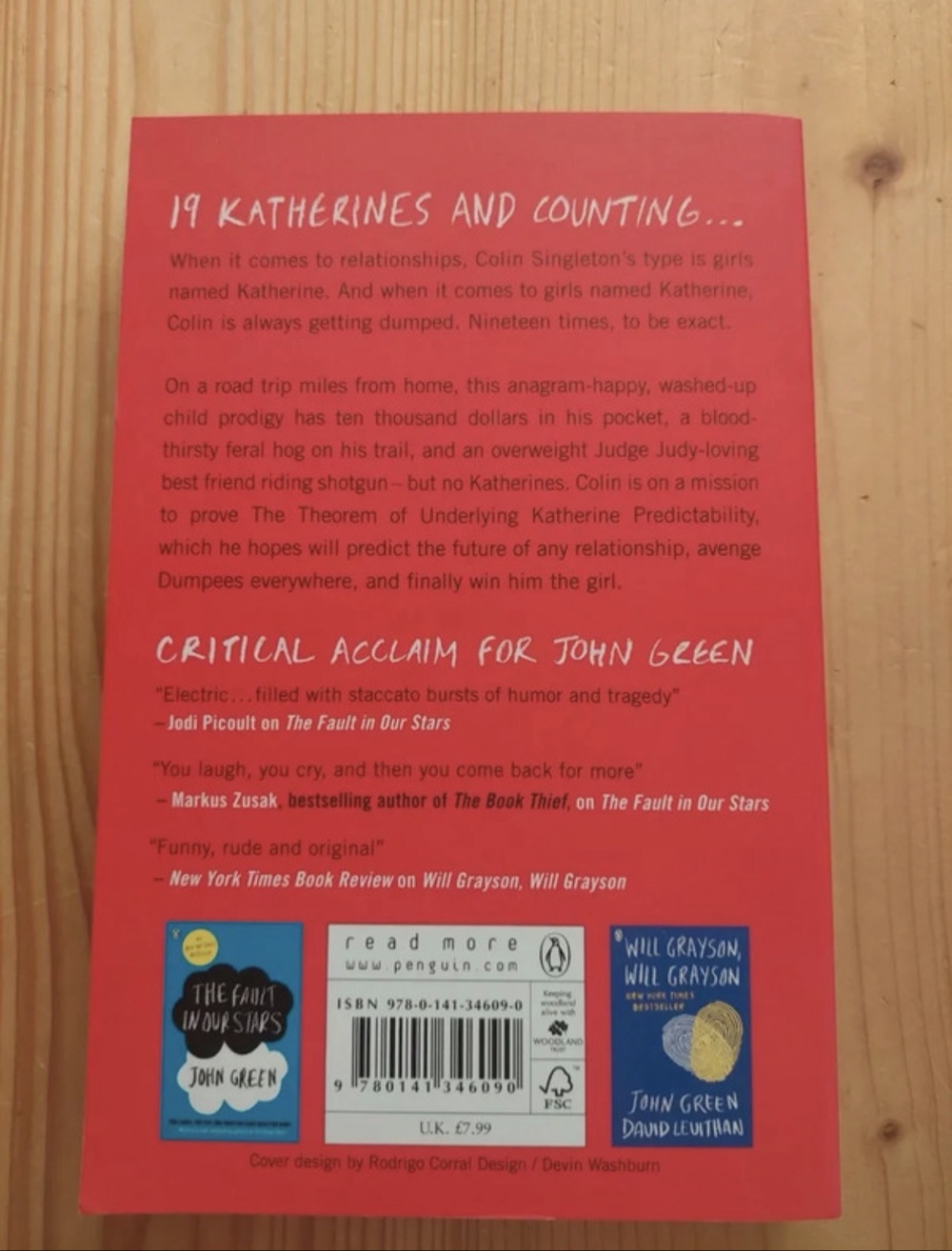 Paperback novel An Abundance of Katherines by John Green. New York Times bestseller.