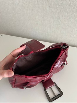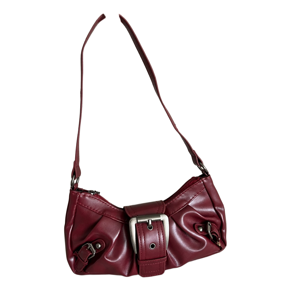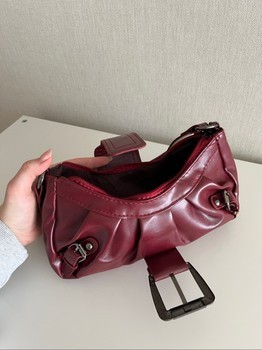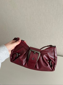 Small burgundy shoulder bag with a buckle detail on the front. Features a top zip closure.