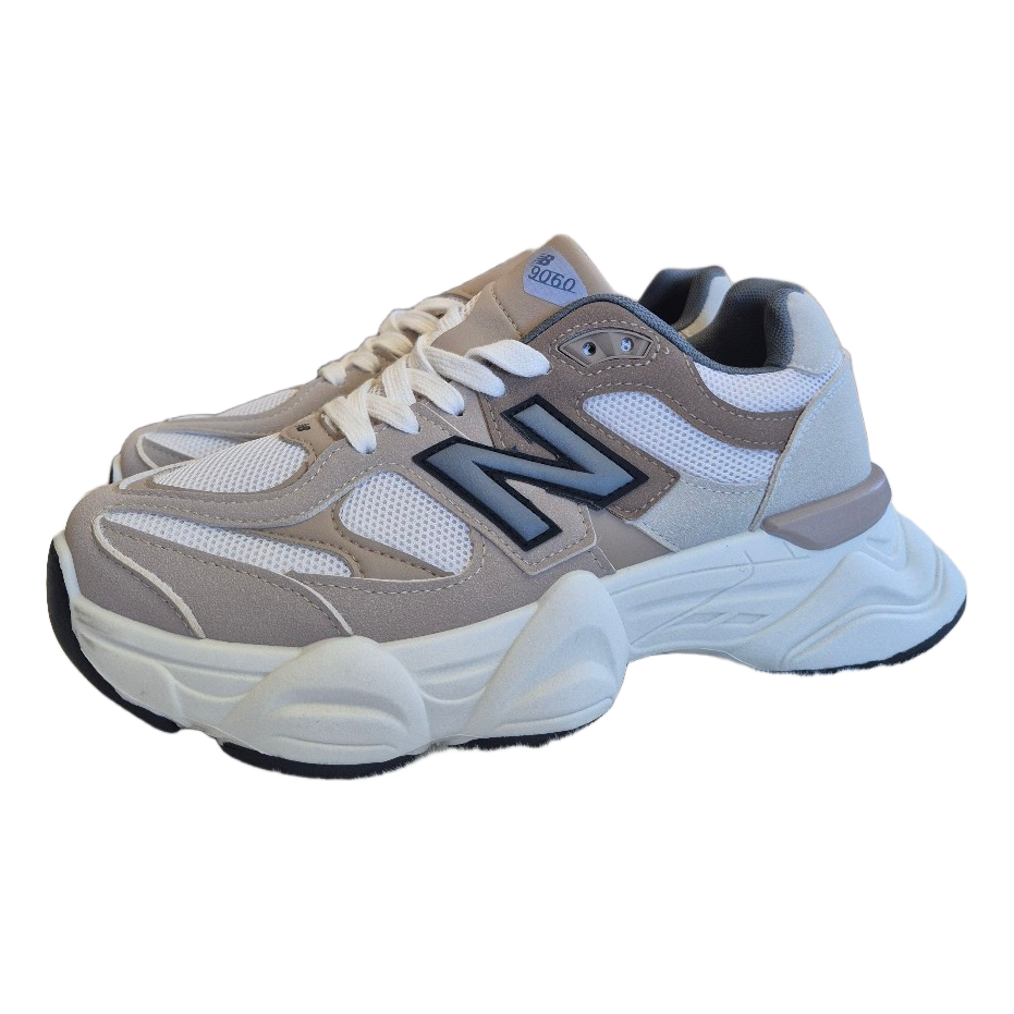 Beige and white New Balance 9060 sneakers with classic N logo on side. Detailed chunky sole design. Dydžiai 37, 38, 39 rašykite