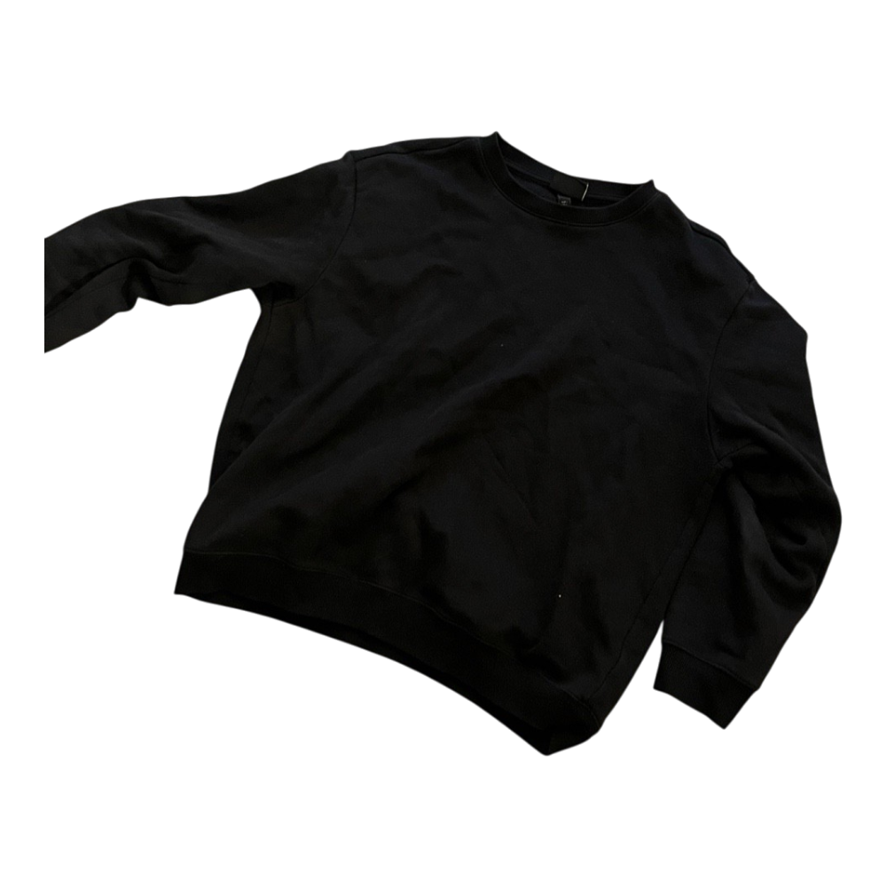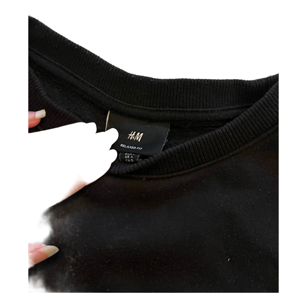 Black long-sleeved sweatshirt. Size L, relaxed fit model.