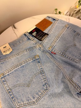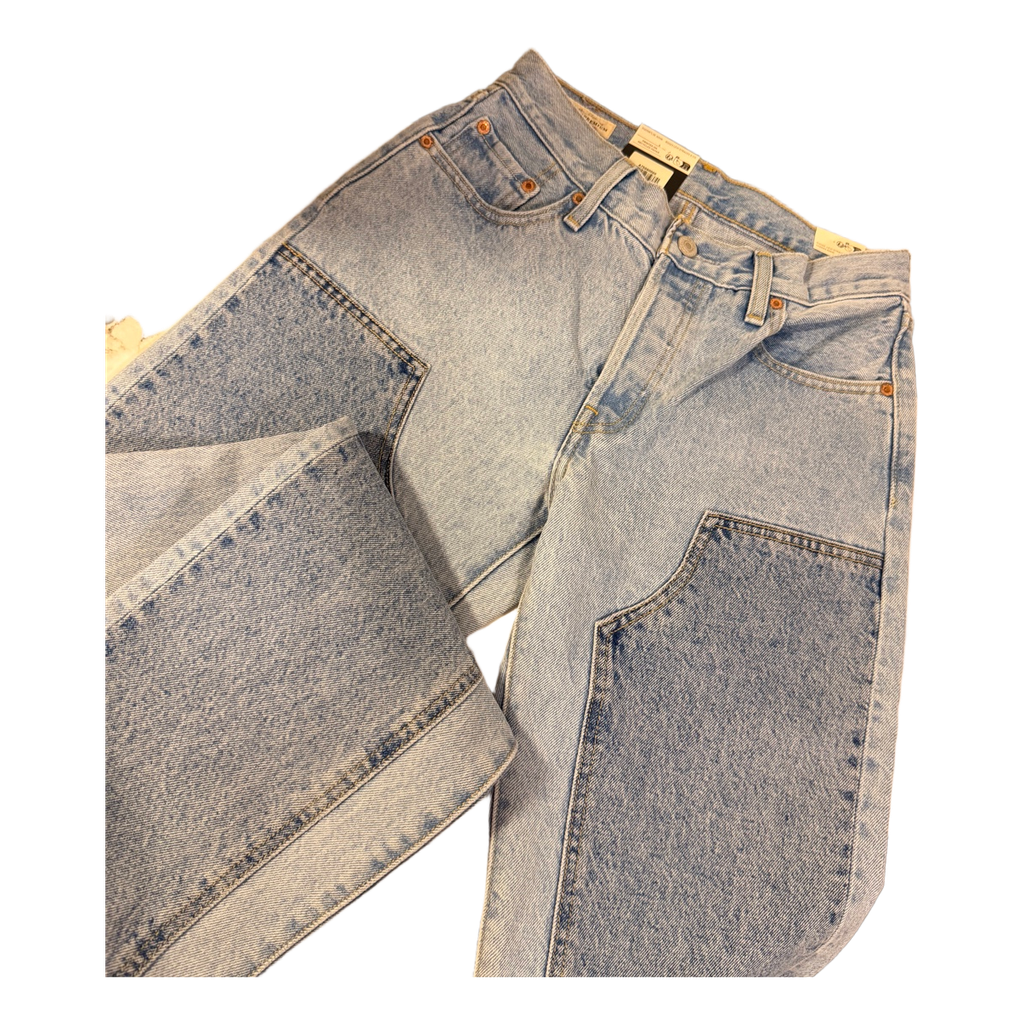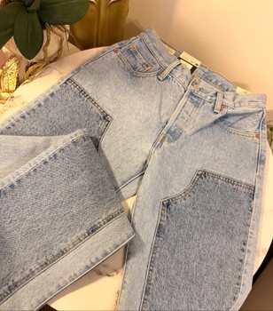 Light wash blue denim jeans with a straight leg fit. Features a mid-rise waist and traditional button fly closure. Size 25 x 32.