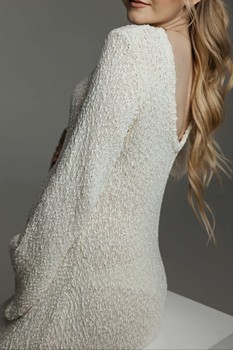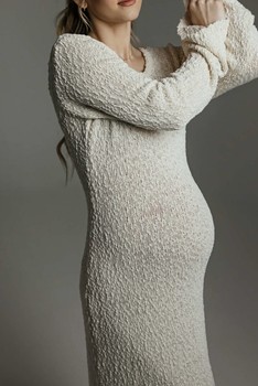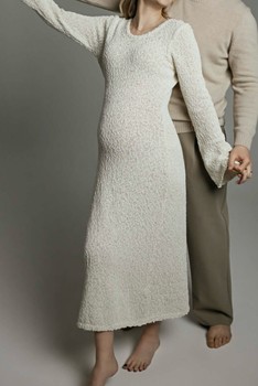 Cream long-sleeved midi dress in a textured knit fabric. Features a rounded neckline and flared sleeves. Size M.