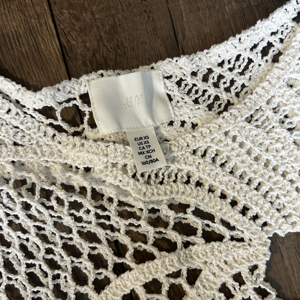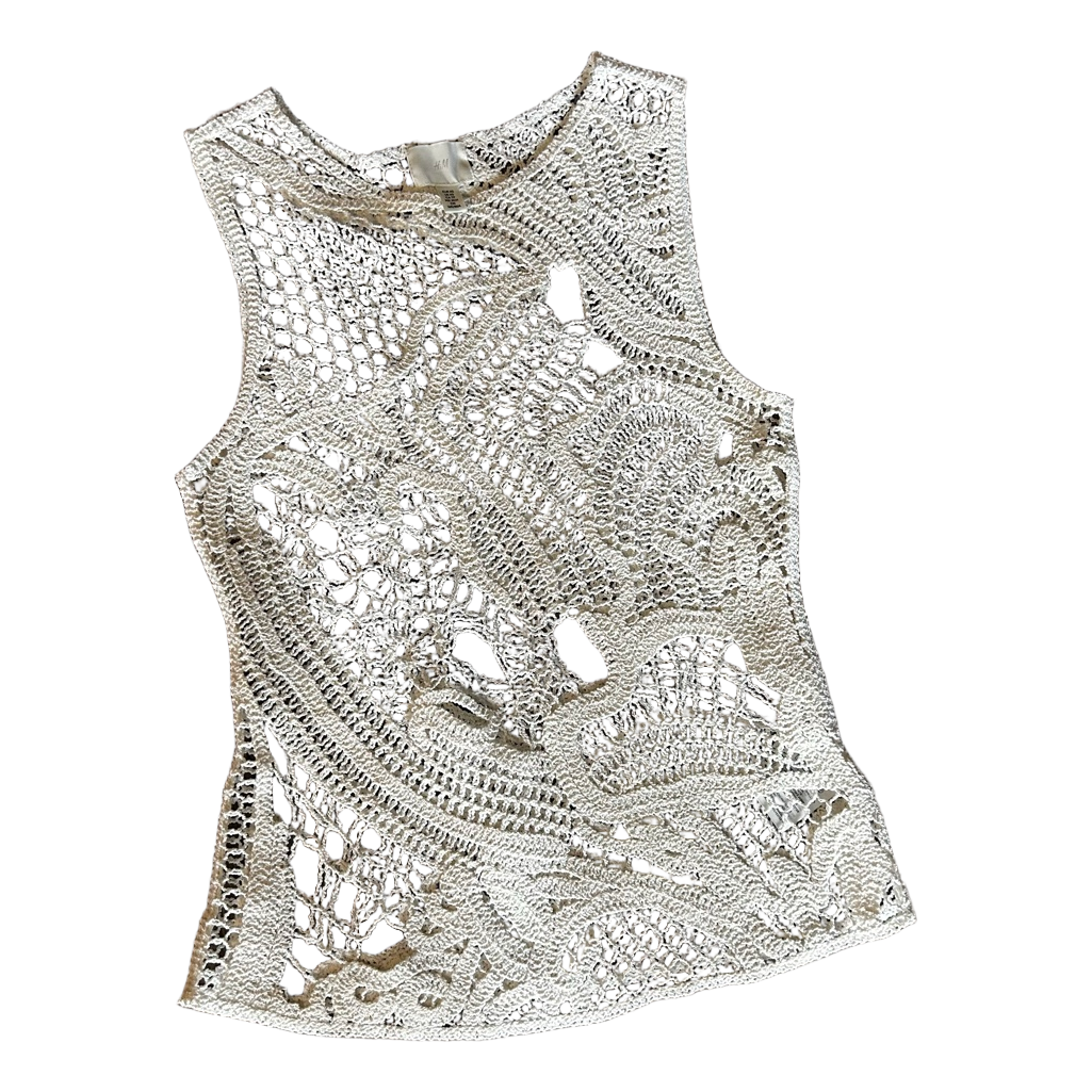 White sleeveless crochet top with an intricate patterned design. Size XS.