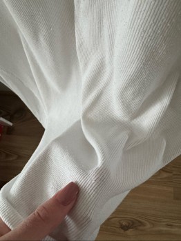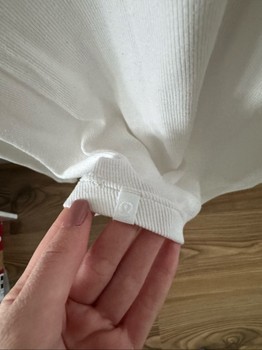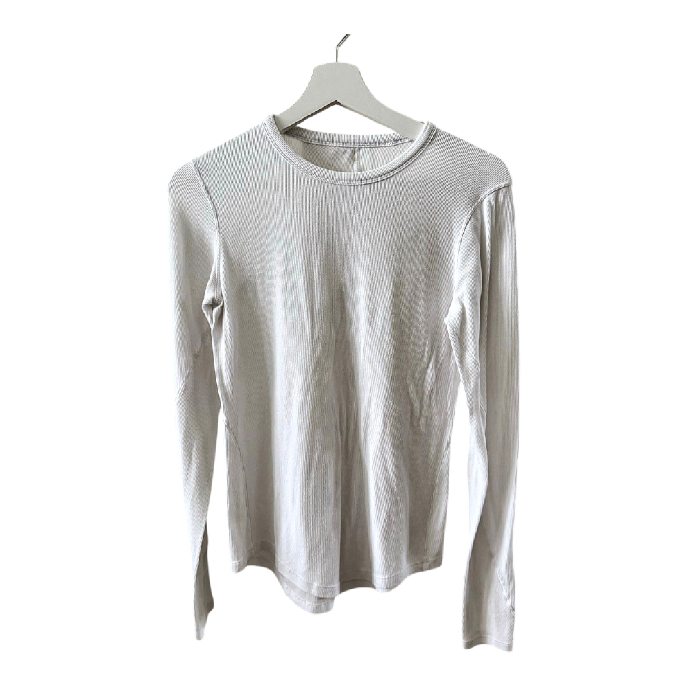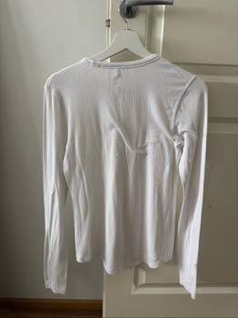 White Lululemon long-sleeve ribbed shirt. At the hem a very small hole (photo 2), but not noticeable in use. Size ~M.