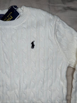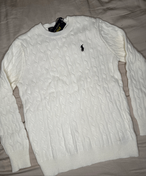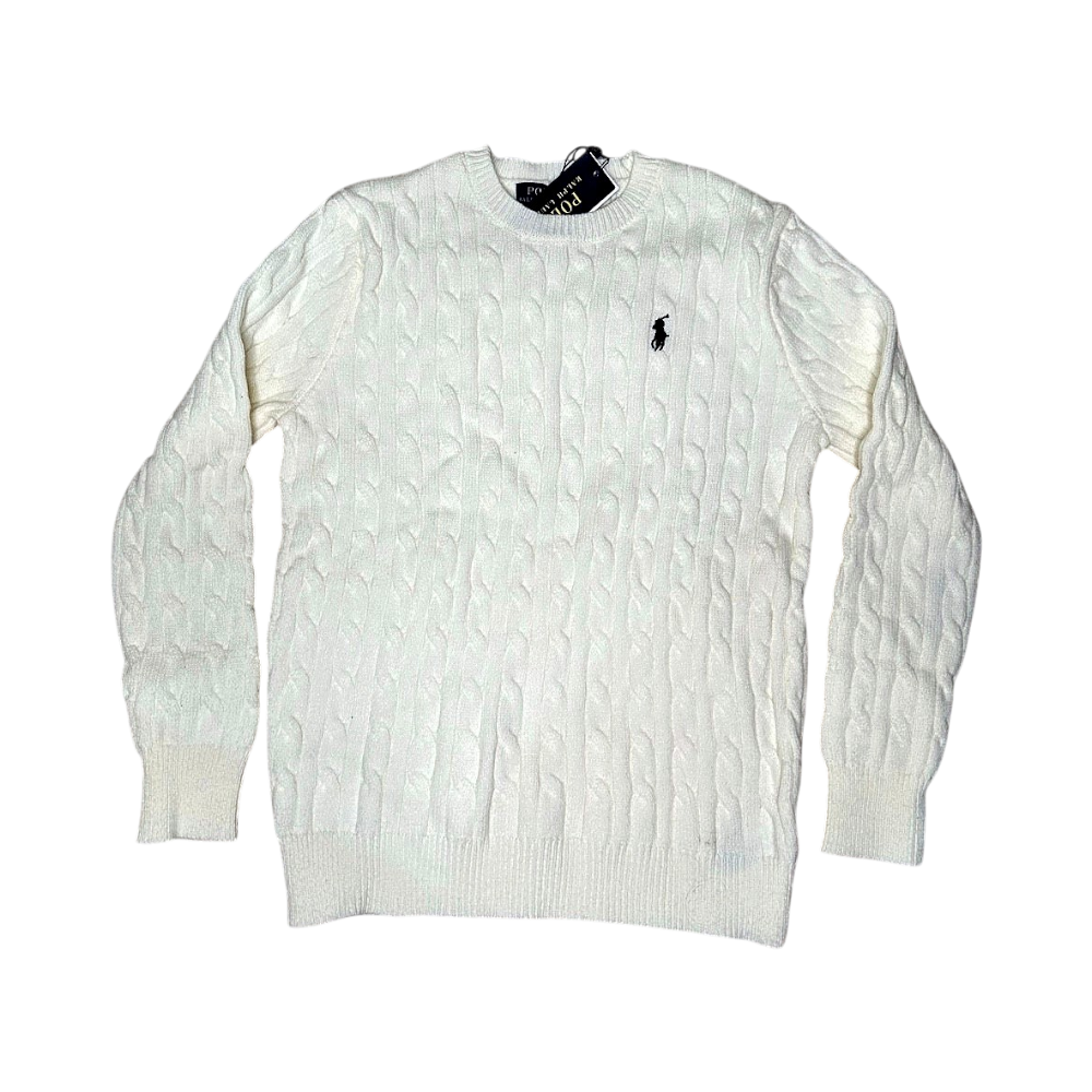 White cable knit sweater featuring a round neckline and long sleeves. Includes a small logo on the chest. Perfect for layering during colder months.