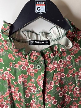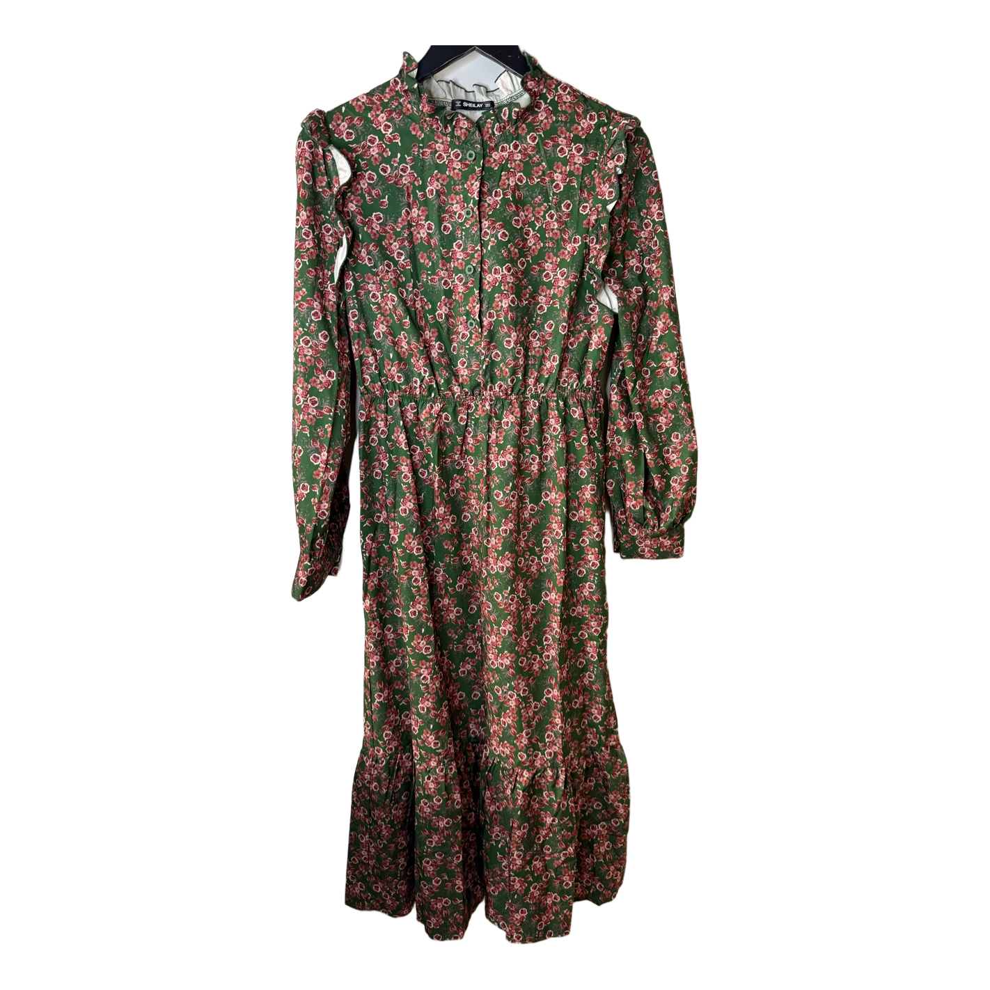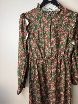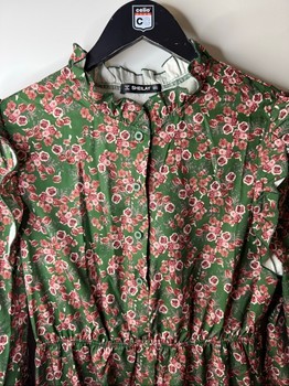Green dress with floral pattern, buttoned front, and ruffled details. Long sleeves with cuffs, elasticated waist. Size M.