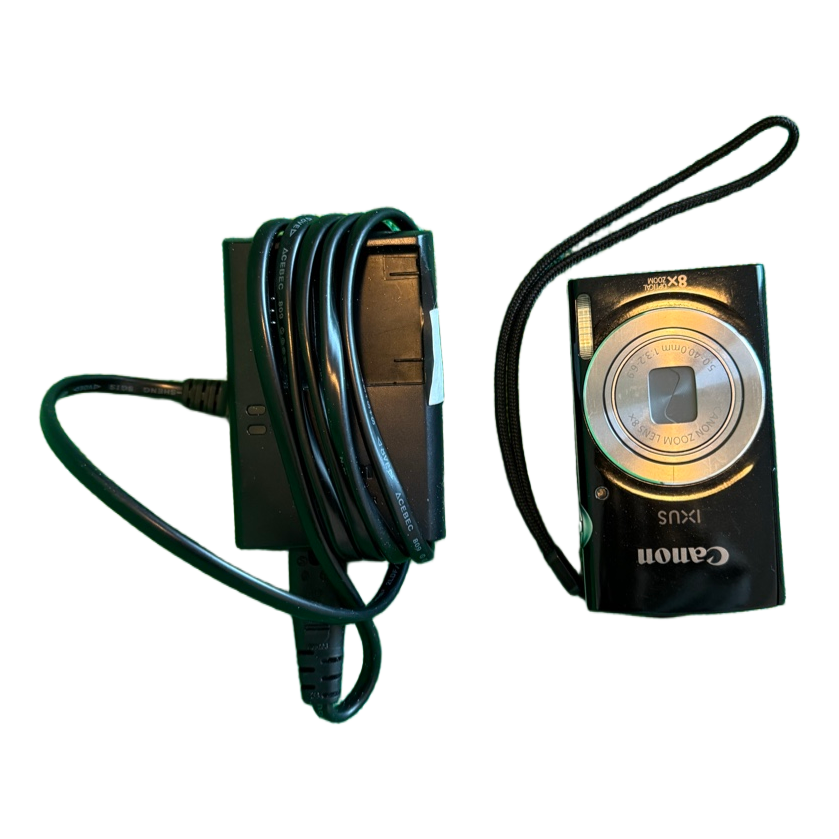 Black Canon Ixus 147 digital camera. Includes power cable. Battery, charger and memory card included.