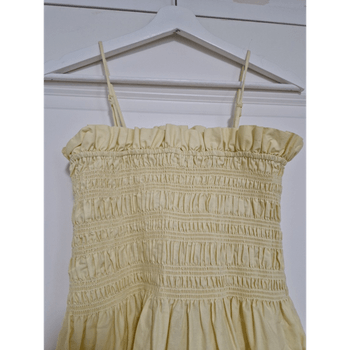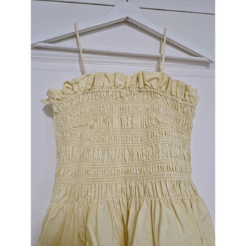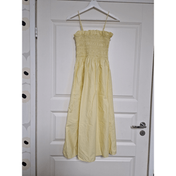 The bodice stretches easily a lot; the fabric itself does not stretch but there is an elastic seam. Suitable for parties and everyday. Pit-to-pit 33 cm. Armpit-to-hem 97 cm. Strapless, Cotton, Stretchy, Adjustable straps, Removable straps, Spaghetti strap