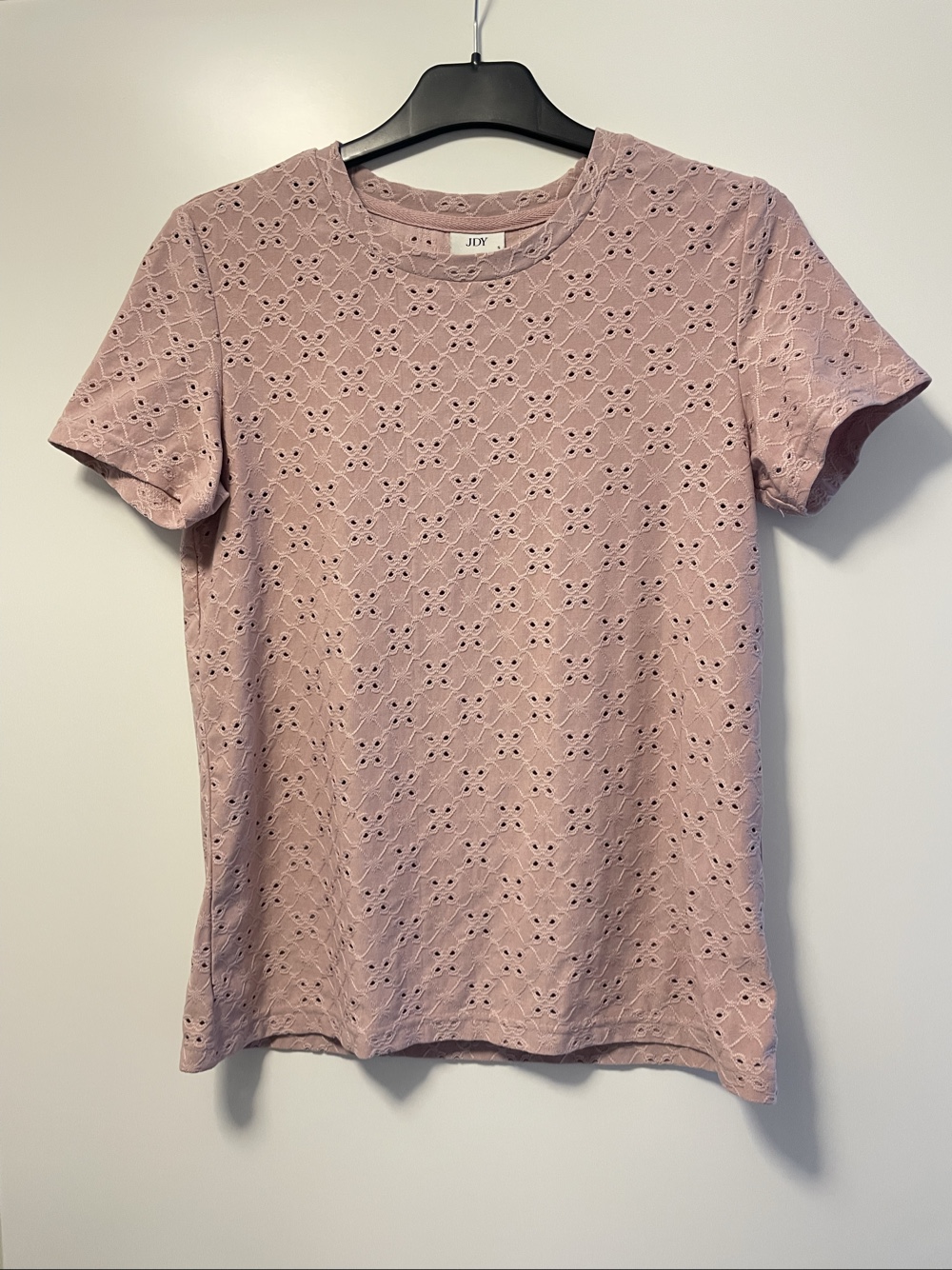 Pink t-shirt with all-over eyelet embroidery. Short sleeves and round neckline.