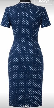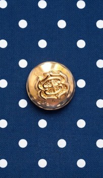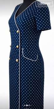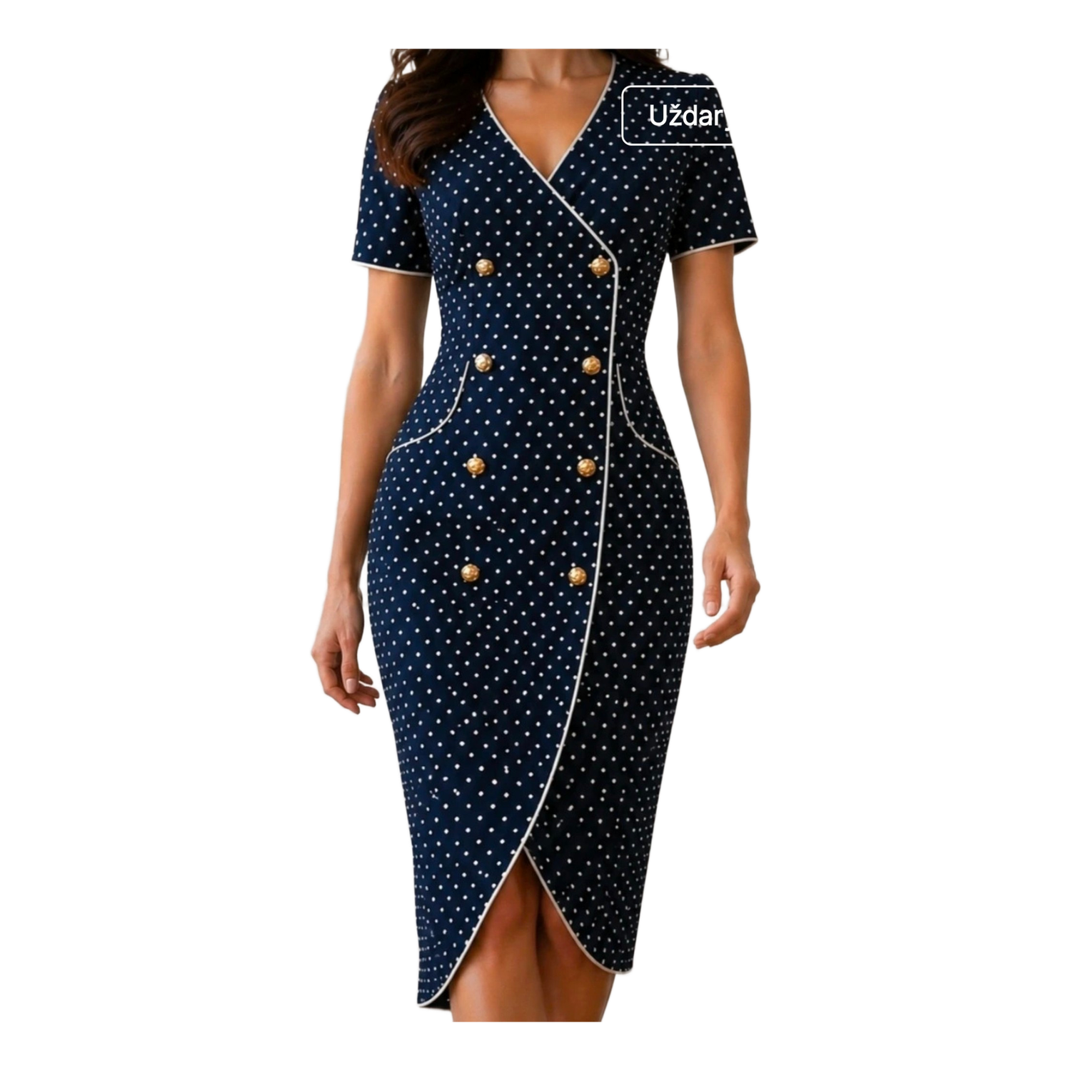 Double-breasted midi dress with polka dot pattern and gold-tone decorative buttons. Features white trim detailing.