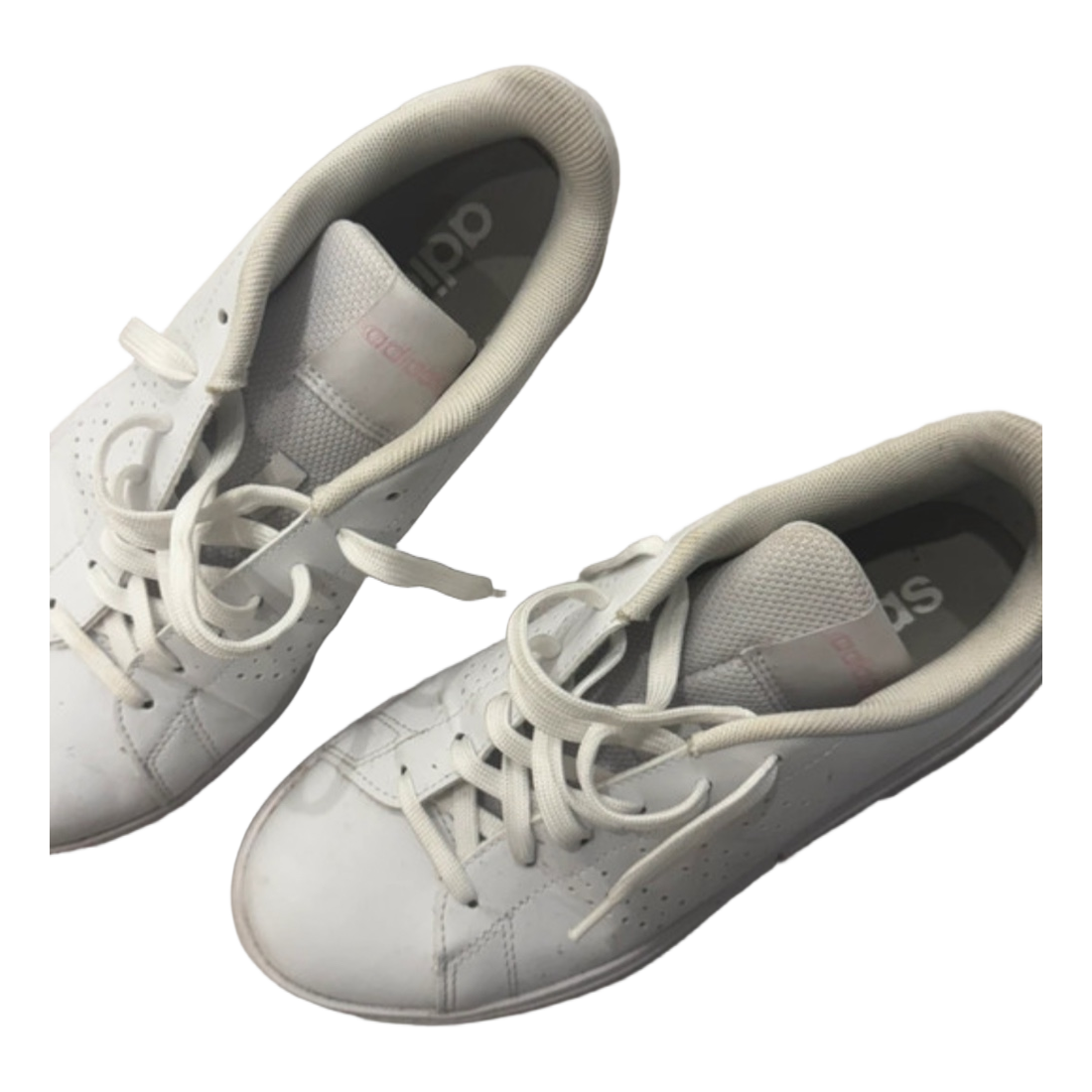 White adidas sneakers with lace-up closure.