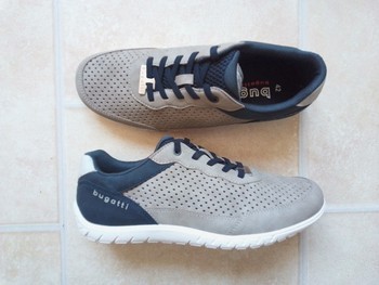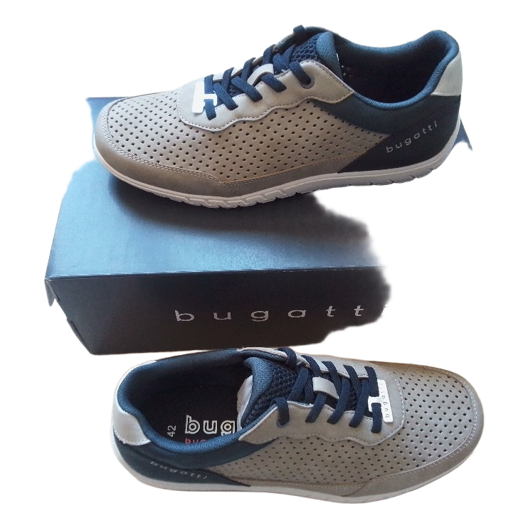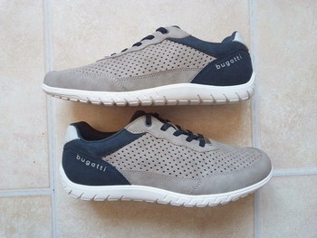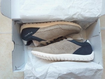 Perforated taupe sneakers with dark blue accents and white soles. New in box. Size 42.