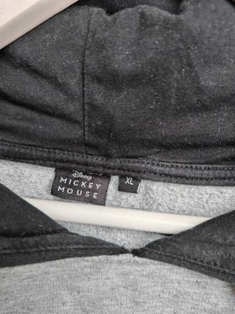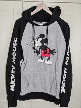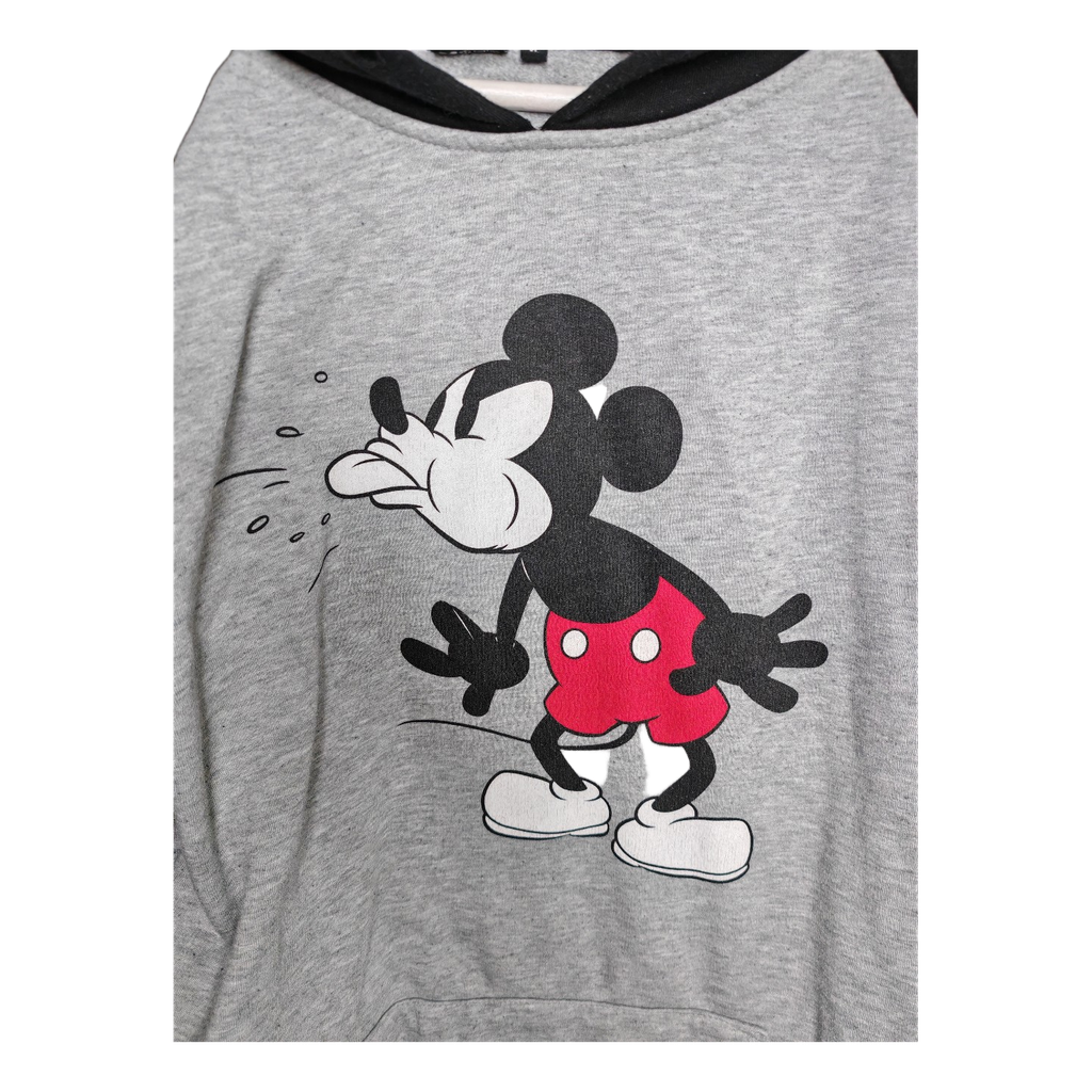 Grey Mickey Mouse hoodie with black sleeves and hood. Size L, made from organic cotton. Pilling visible.