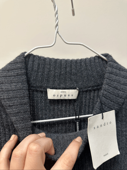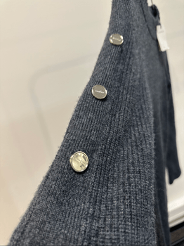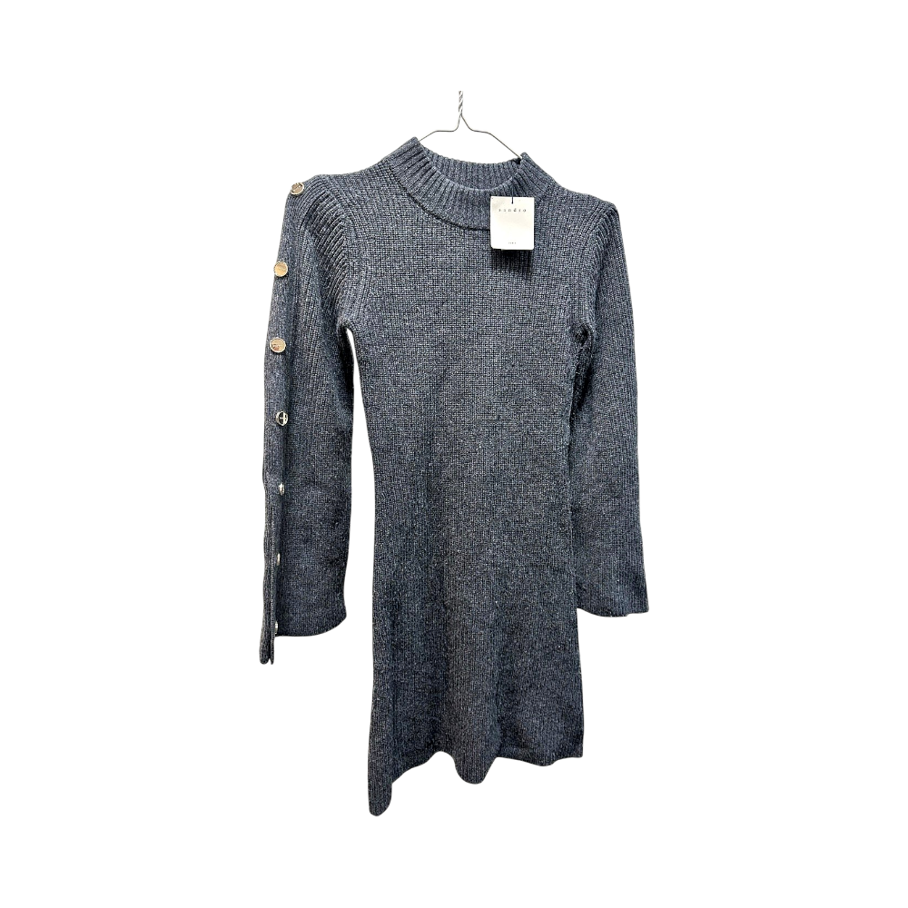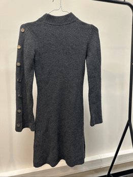 Grey knit dress featuring a high neck and button details on one sleeve. Made from a ribbed fabric with a fitted silhouette.