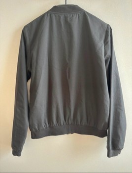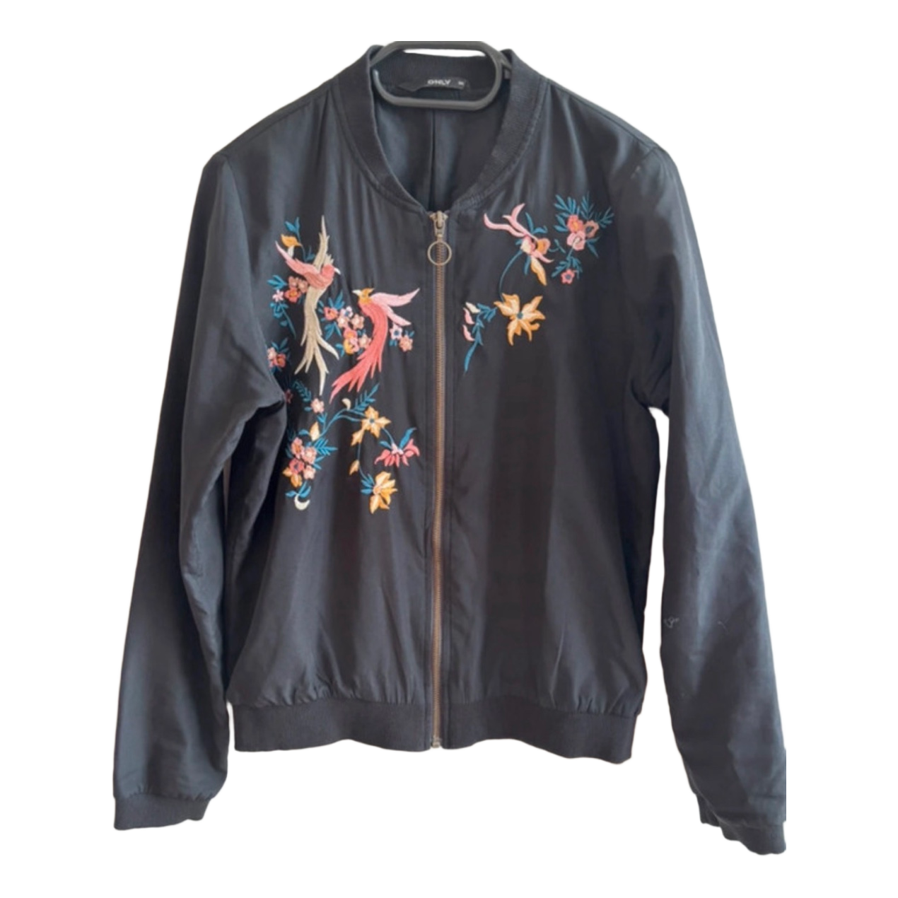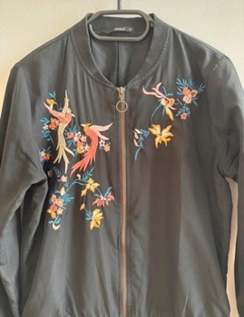 Black bomber jacket with colorful bird and floral embroidery. Features a front zipper closure.