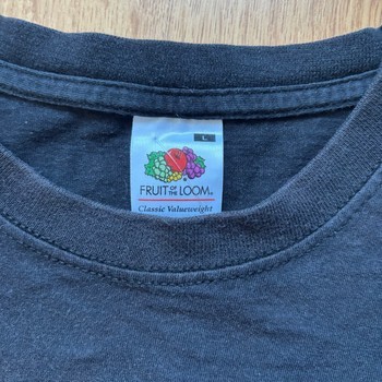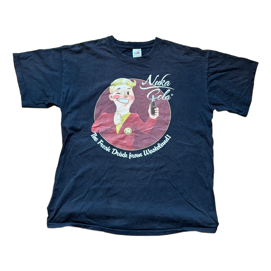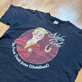 Black t-shirt featuring a Nuka Cola graphic print. Short sleeves with a round neckline. Size L.