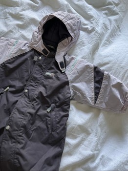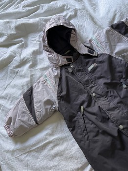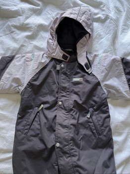 Reima padded snowsuit. Detachable hood and leg straps. Size 80. One elastic band broken. Used as a yard snowsuit.