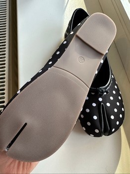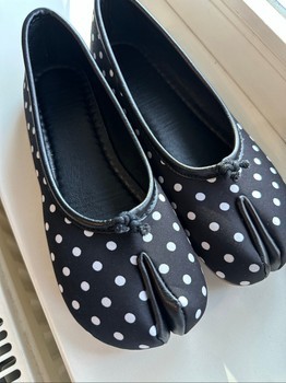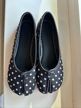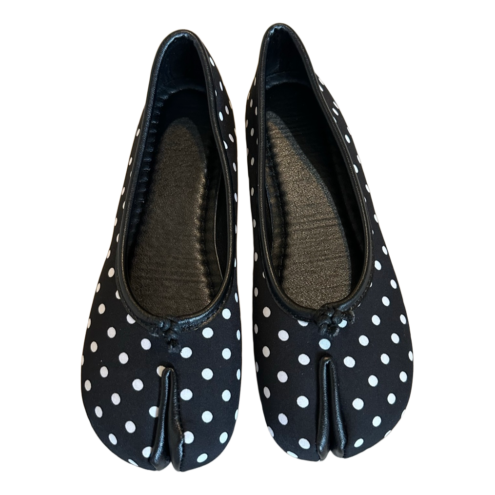 Black and white polka dot split-toe flat shoes. Size 39.