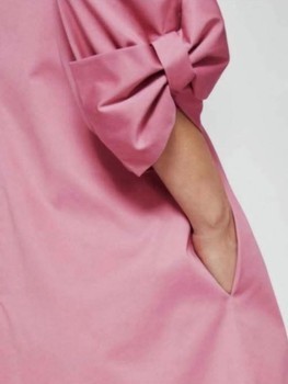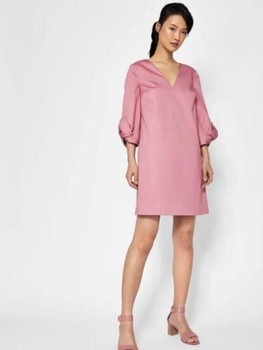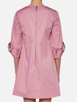 Ted Baker dress in soft pink. Features a V-neckline and decorative bows on the sleeves. Finished with a rose-gold zip closure at the back. Comfortable and non-see-through cotton.