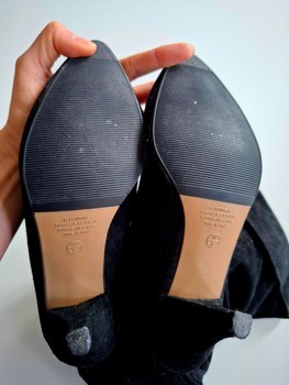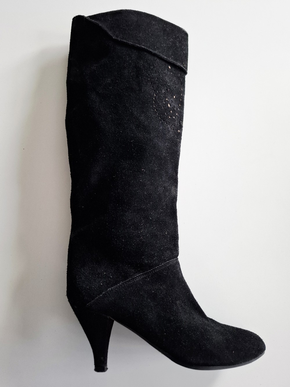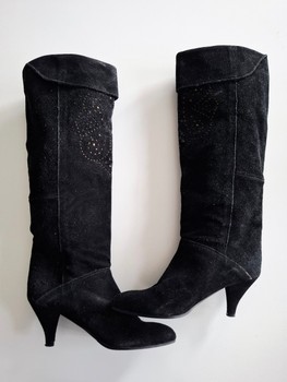 Black genuine suede leather boots with decorative cutout details and a kitten heel. Made in Italy. Magnificent black vintage suede leather boots. Size marking 38, but in my opinion corresponds to size 37. For me, size 36 they are a bit too big. Inner length (a bit difficult to measure) approx. 24 cm, heel 7 cm, shaft length (without heel) 38 cm. Good condition, small signs of use. Check also my other listings, package prices possible! Please do not make outrageously low offers, thanks!