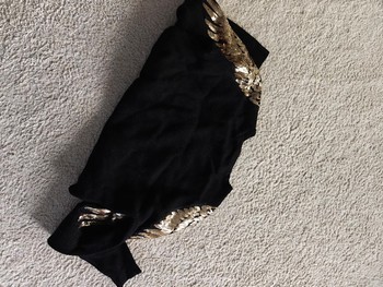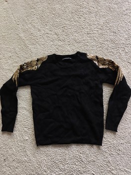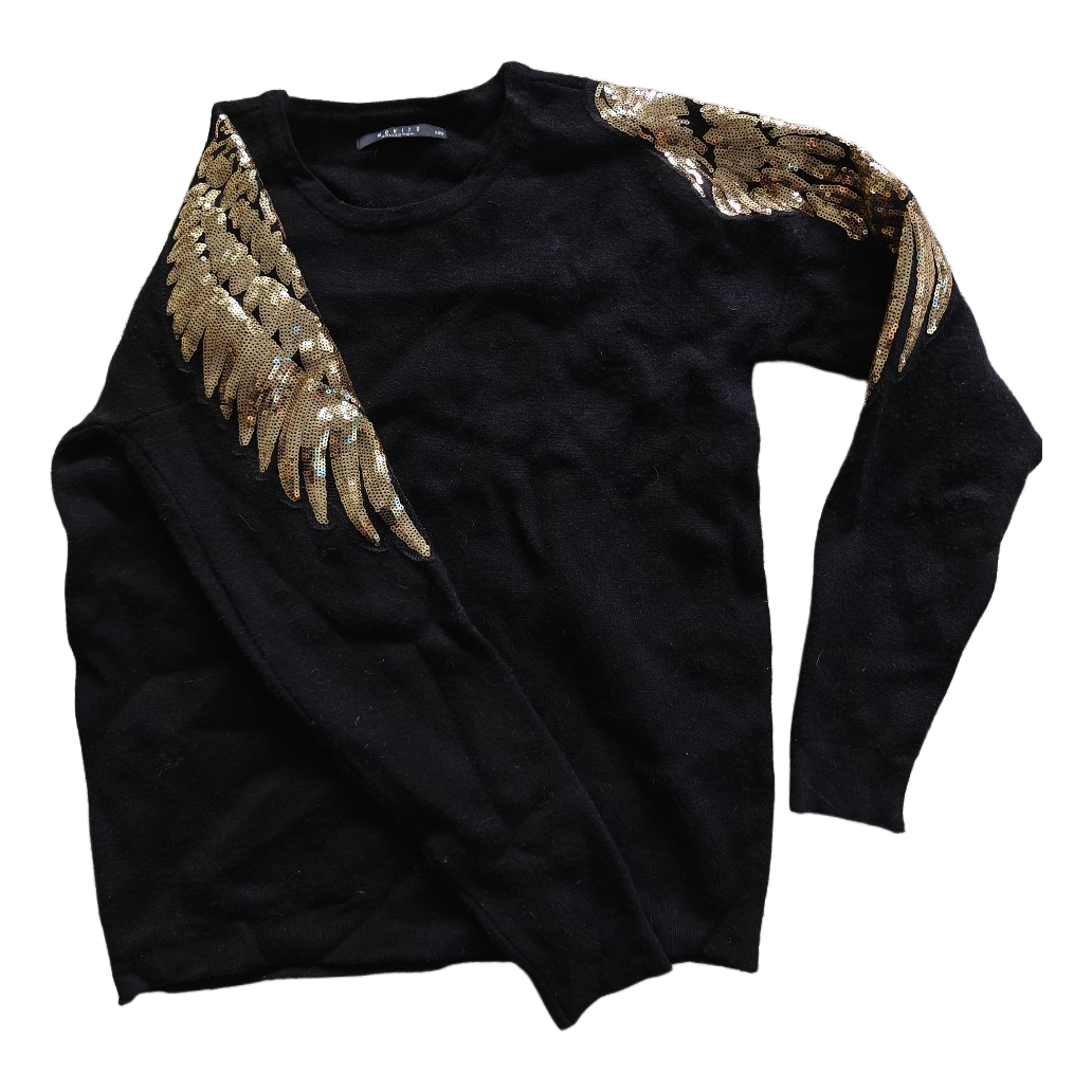 Black Mohito long-sleeve knit with gold-colored wing-themed sequin details on the shoulders. Size XXS but also fits XS. The fabric is stretchy.