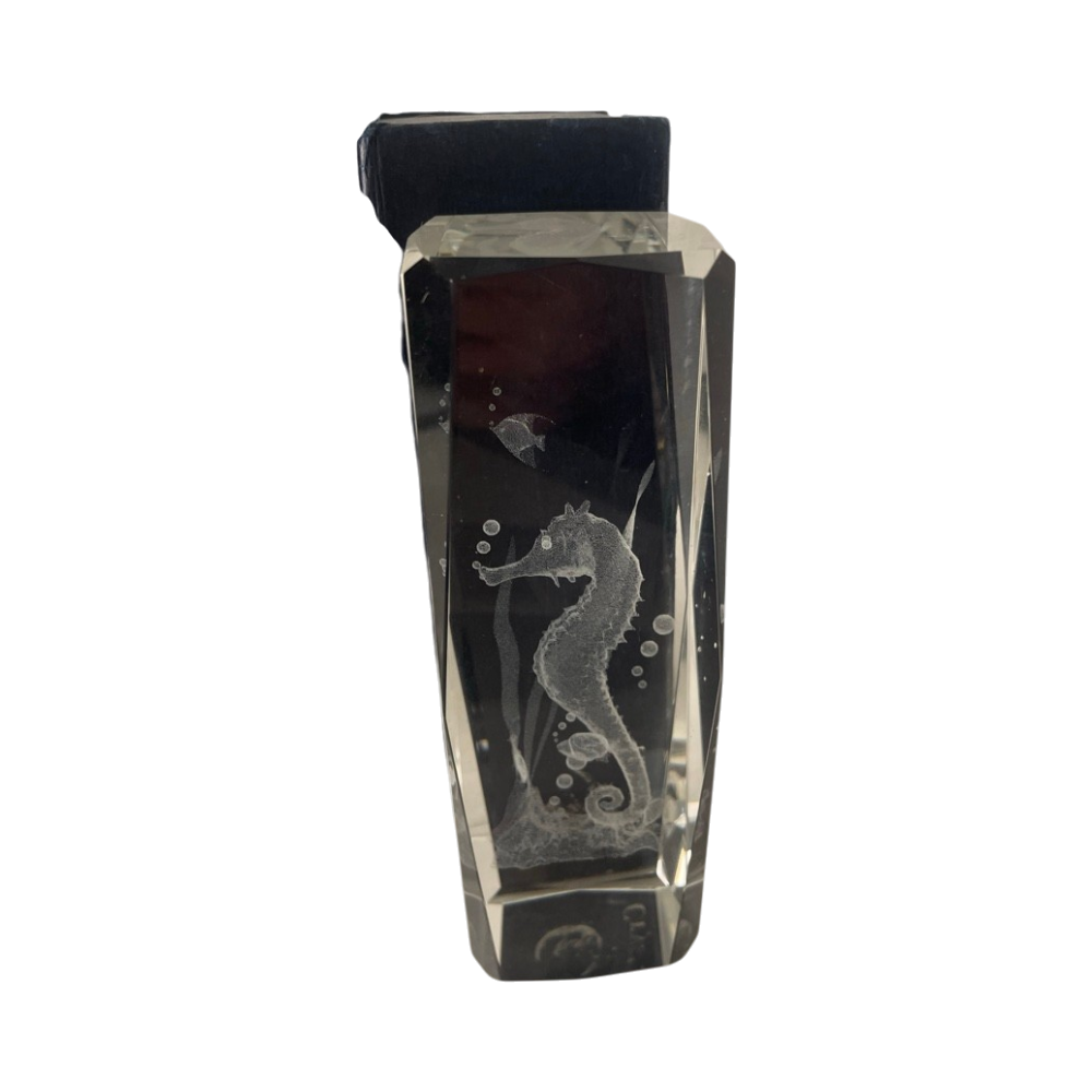 Kristallipatsas, sisällä kaiverrettu merihevonen. Pieniä huomaamattomia kolhuja