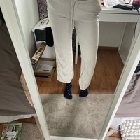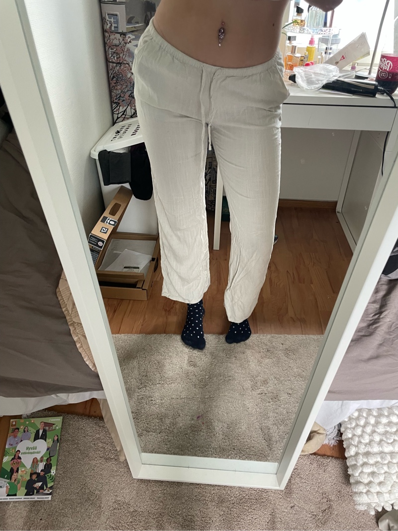 Beiget/luonnonvalkoiset, leveät pellavahousut, kuminauhavyötäröllä ja naruilla. Koko s, matalavyötäröiset.
