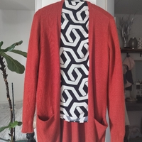 Pitkä oranssinpunainen neuletakki, taskuilla.