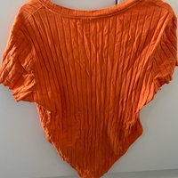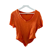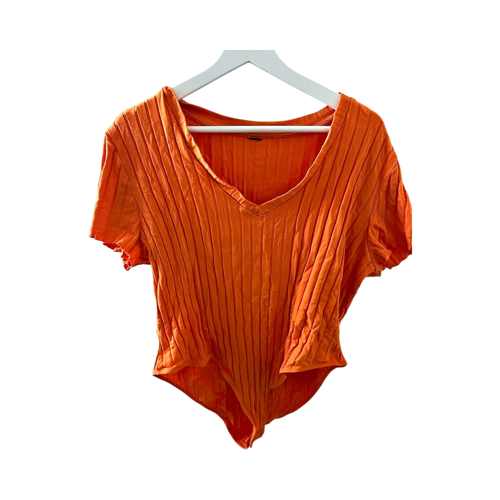 Oranssi ribbineulottu lyhythihainen bodypaita. Koko- ja materiaalilaput leikattu irti.