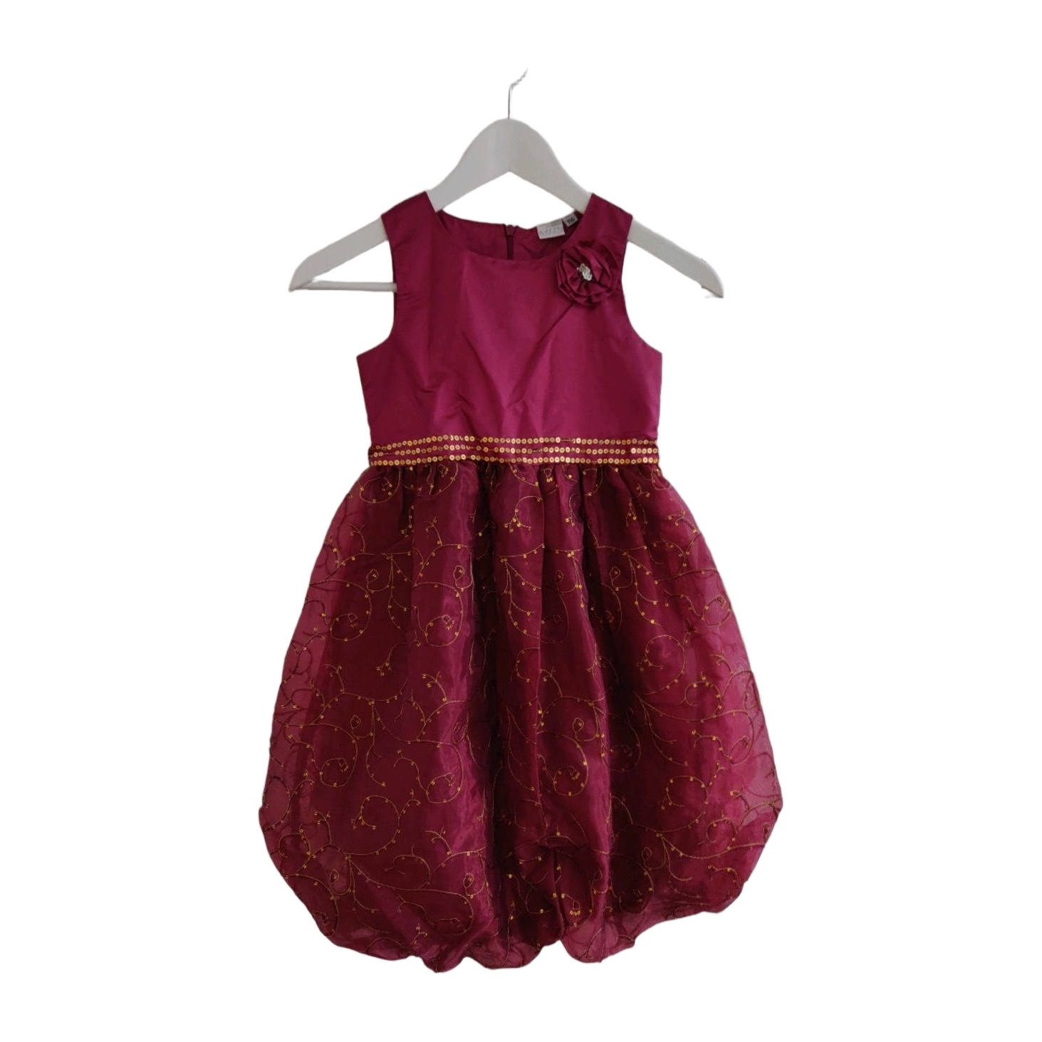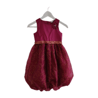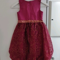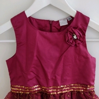 Lähes uudenveroinen ihana viininpunainen satiinimekko kultaisilla yksityiskohdilla, takana vetoketju. Koko 116cm. Satiini/sifonki.