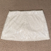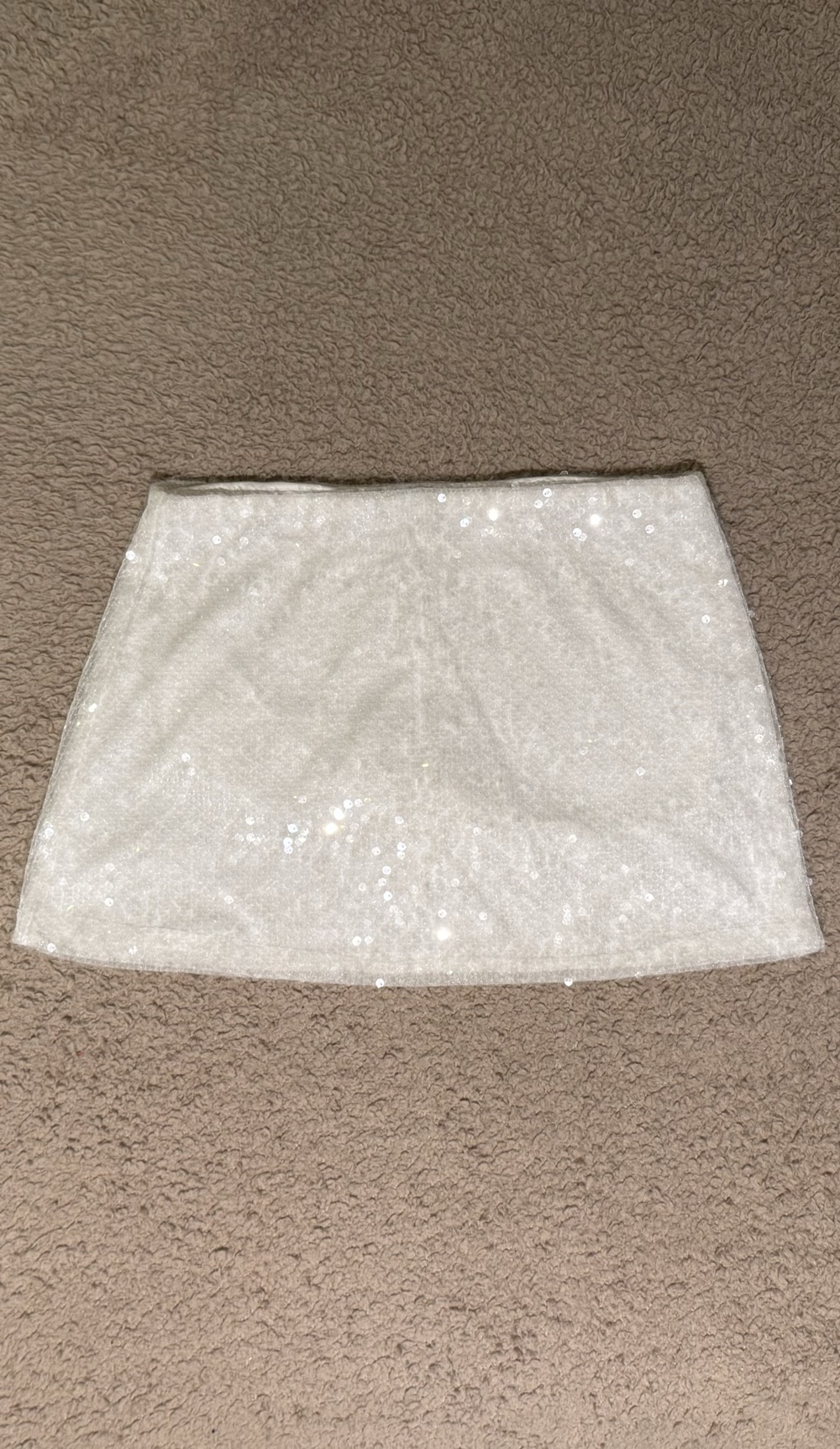 Käyttämätön valkoinen Bershkan paljettihame, jossa alla shortsit.