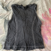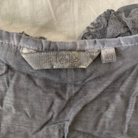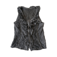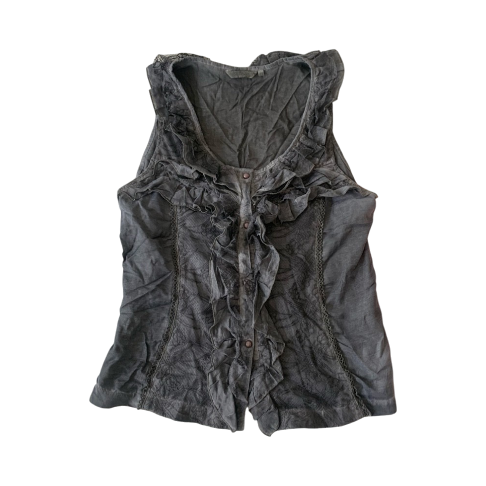 Grey sleeveless top with front ruffles and lace details.