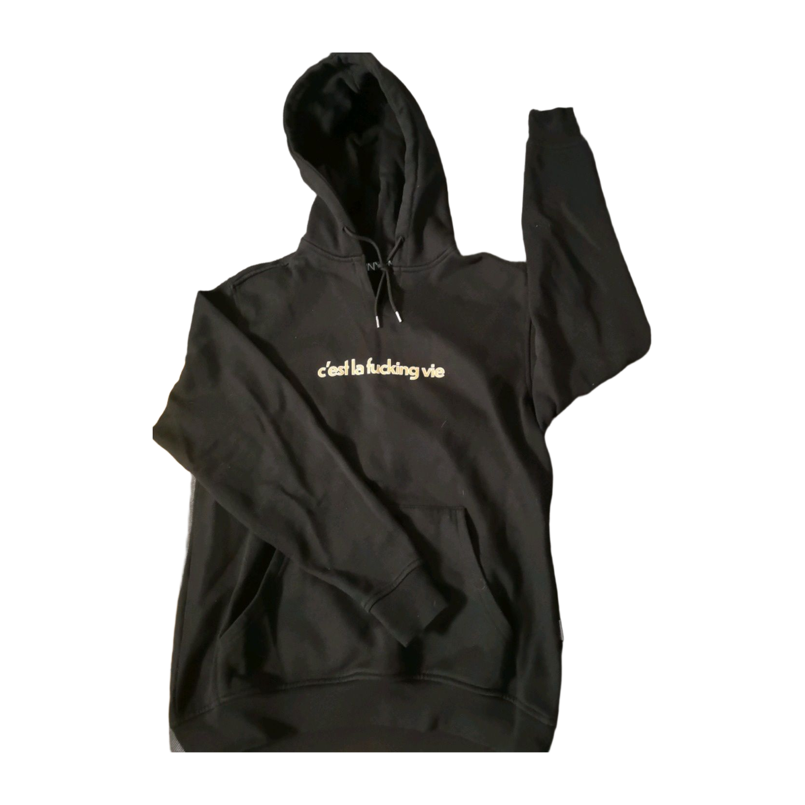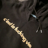 Carlingsista ostettu huppari, jossa lukee c'est la fucking vie sinapin värisellä tekstillä.