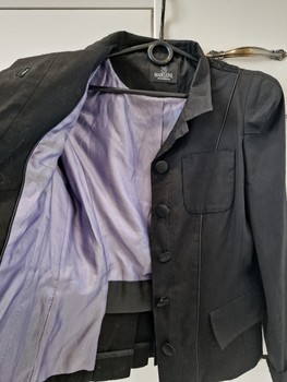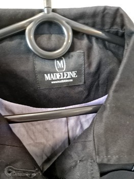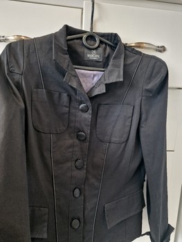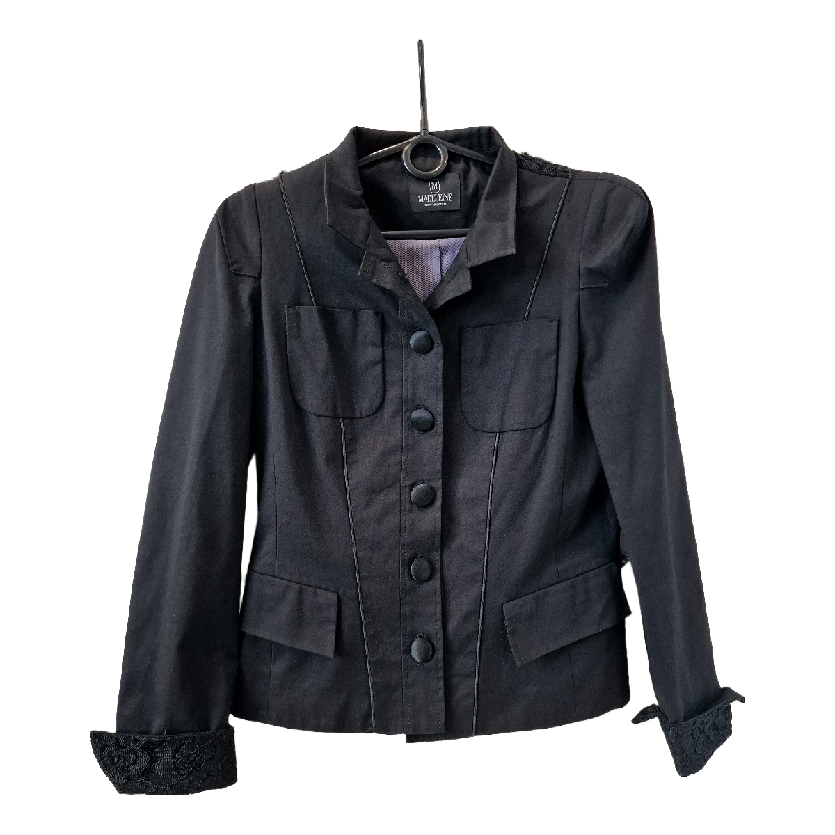 Black button-down blazer by Madeleine with lace details on the cuffs and back. Featuring pockets and a pleated hem. Made from cotton and elastane.
