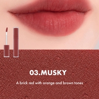 Suositun kbeauty brändin Rom&nd Matta nestemäinen huuliväri, tiilenpunainen sävy (03 Musky).