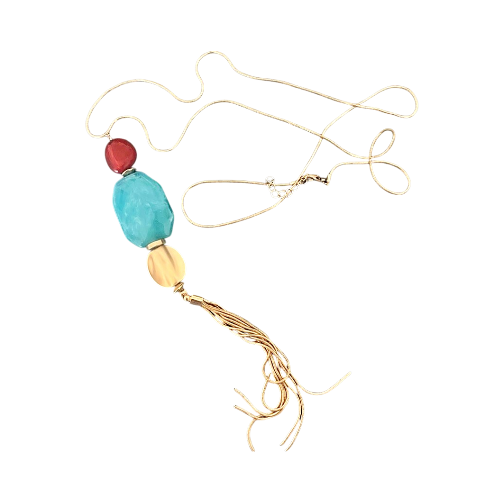 Pitkä kaulakoru turkoosilla helmellä ja kultatasselilla. Ei käytetty