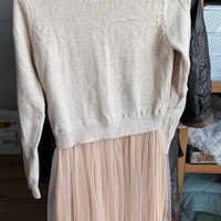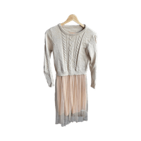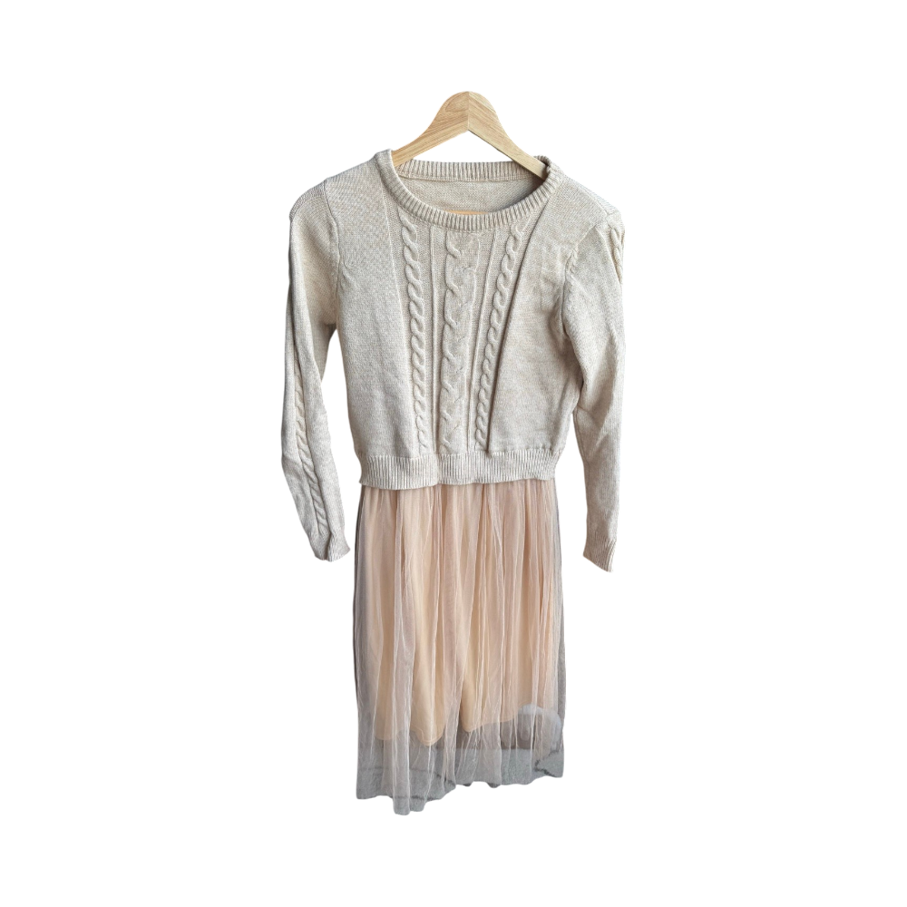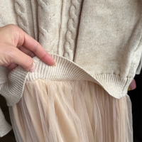 Cable-knit sweater top with layered tulle skirt, soft neutral tones.