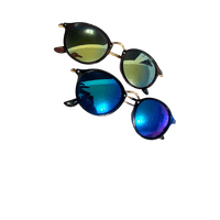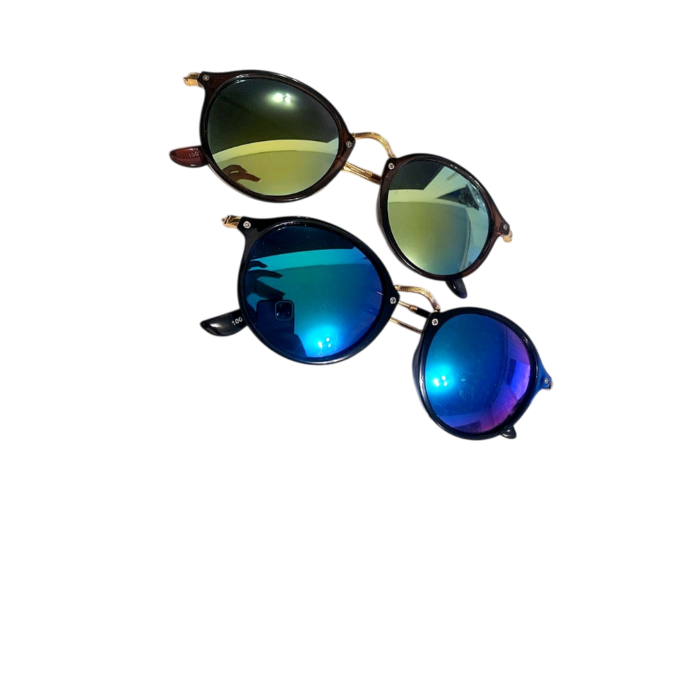 Kaksi paria pyöreitä aurinkolaseja, heijastavat linssit. Sinisemmissä mustat kehykset, vihreämmissä ruskeat. Kultaiset yksityiskohdat molemmissa. 100% uv-suoja.